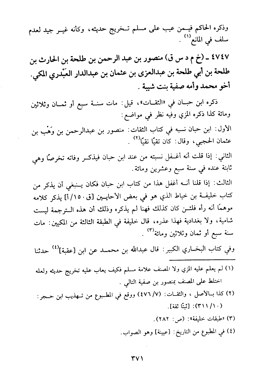 4747 - (خ م د س ق) منصور بن عبد الرحمن بن طلحة بن الحارث بن طلحة بن أبي طلحة بن عبد العزى بن عثمان بن عبد الدار العبدري المكي، أخو محمد، وأمه صفية بنت شيبة.