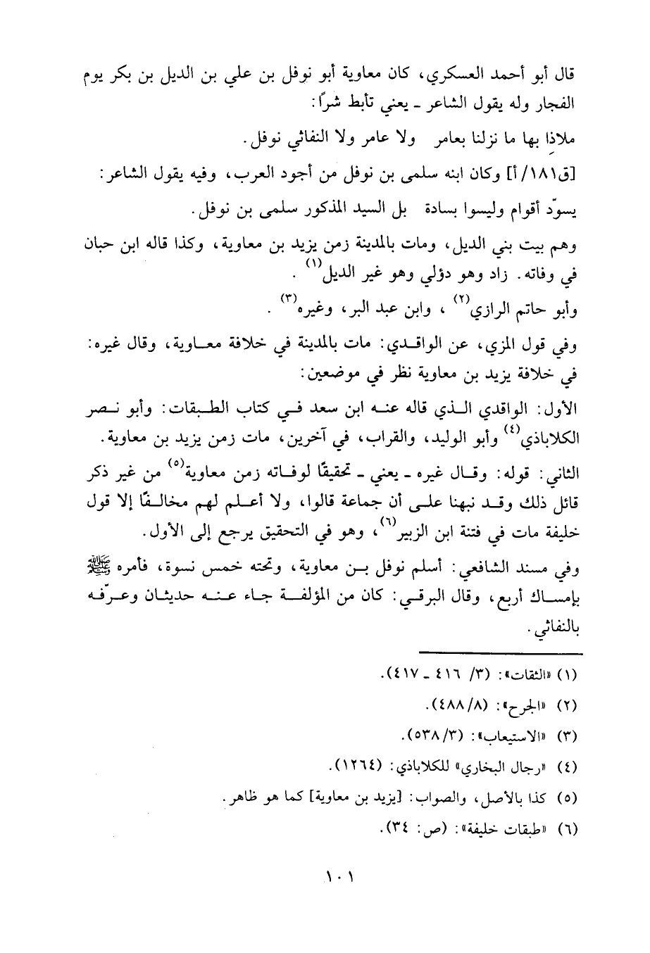 وفي مسند الشافعي: أسلم نوفل بن معاوية وتحته خمس نسوة، فأمره - صلى الله عليه وسلم – بإمساك أربع، وقال البرقي: كان من المؤلفة، جاء عنه حديثان، وعرفه بالنفاثي.
