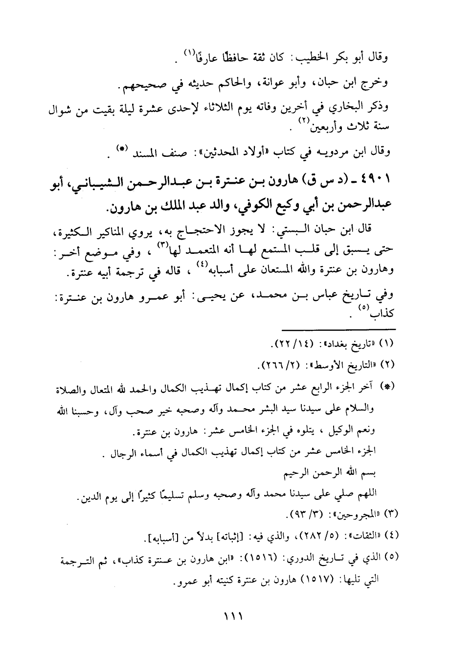 4901 - (د س ق) هارون بن عنترة بن عبد الرحمن الشيباني، أبو عبد الرحمن بن أبي وكيع الكوفي، والد عبد الملك بن هارون.