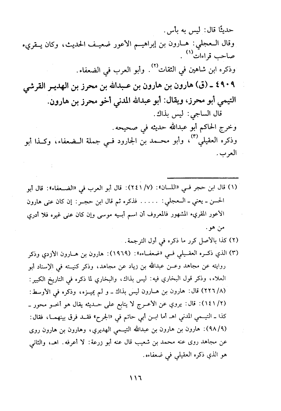 وقال العجلي: هارون بن إبراهيم الأعور ضعيف الحديث، وكان يقرئ، صاحب قراءات.