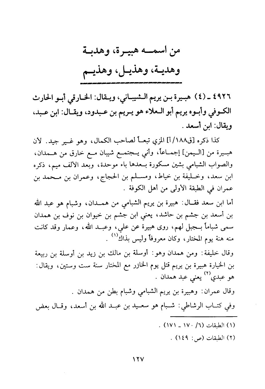 أما ابن سعد فقال: هبيرة بن يريم الشبامي من همدان، وشبام هو عبد الله بن أسعد بن جشم بن حاشد، يعني ابن جشم بن خيوان بن نوف بن همدان، سمي شباما بجبل لهم، روى هبيرة عن علي وعبد الله وعمار، وقد كانت منه هنة يوم المختار، وكان معروفا، وليس بذاك.