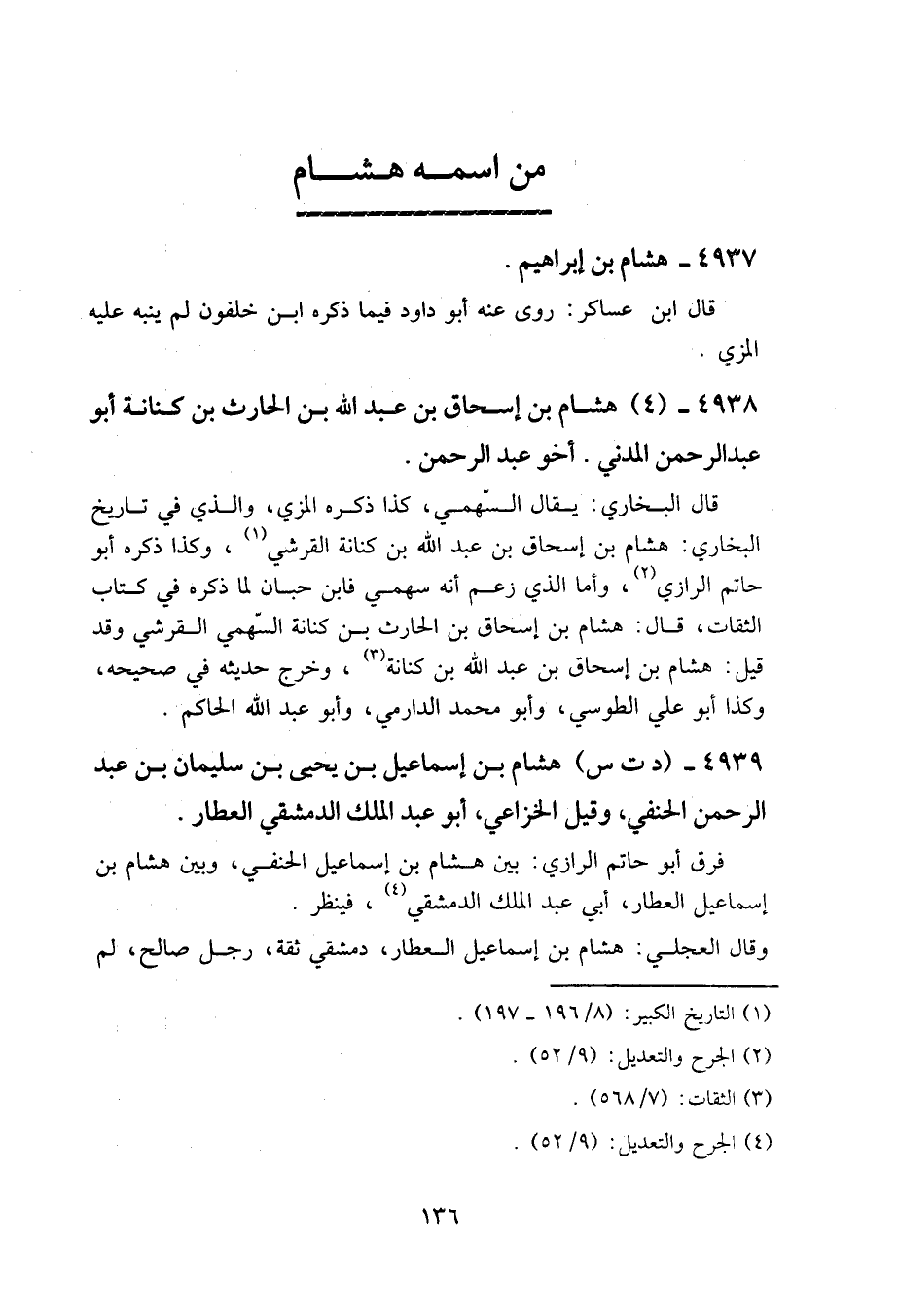 4938 - (4) هشام بن إسحاق بن عبد الله بن الحارث بن كنانة، أبو عبد الرحمن المدني. أخو عبد الرحمن.