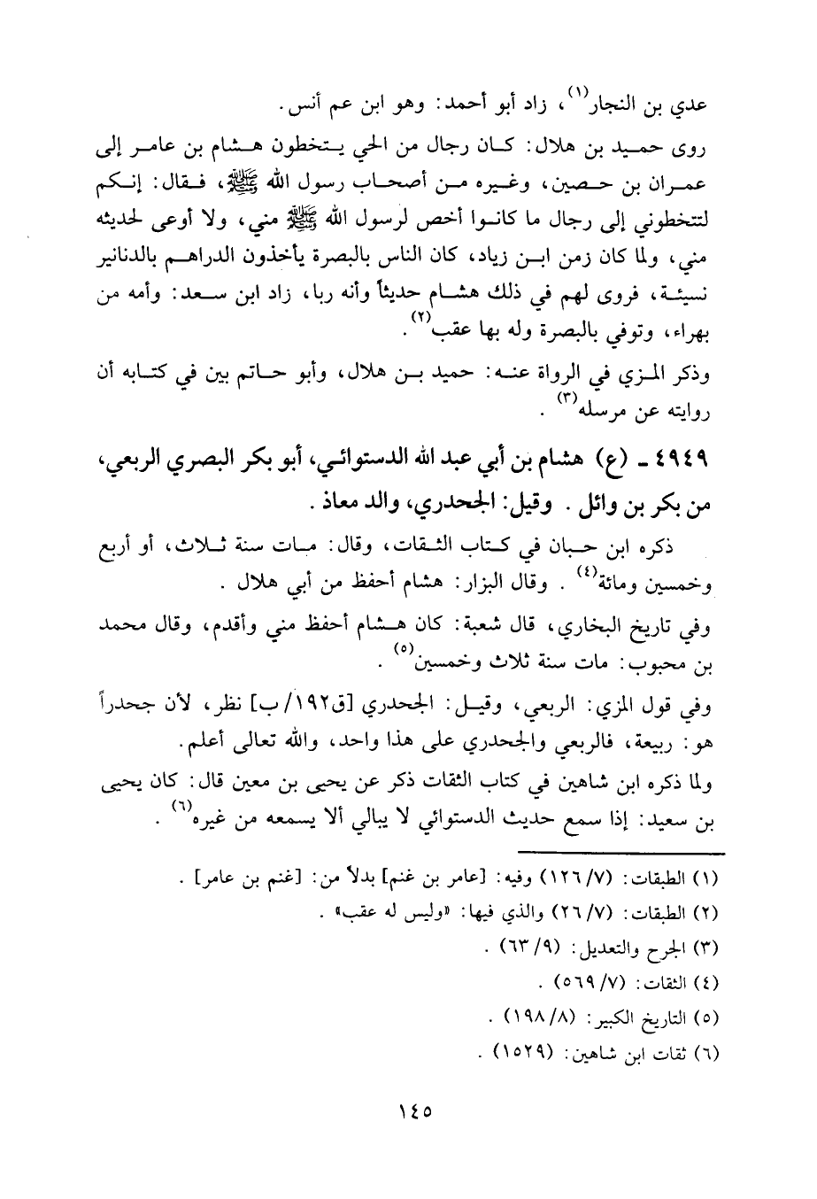 4949 - (ع) هشام بن أبي عبد الله الدستوائي، أبو بكر البصري الربعي، من بكر بن وائل. وقيل: الجحدري، والد معاذ.