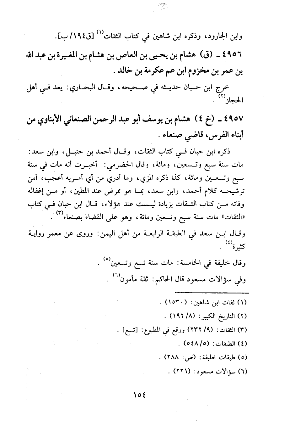 4957 - (خ 4) هشام بن يوسف، أبو عبد الرحمن الصنعاني الأبناوي، من أبناء الفرس، قاضي صنعاء.