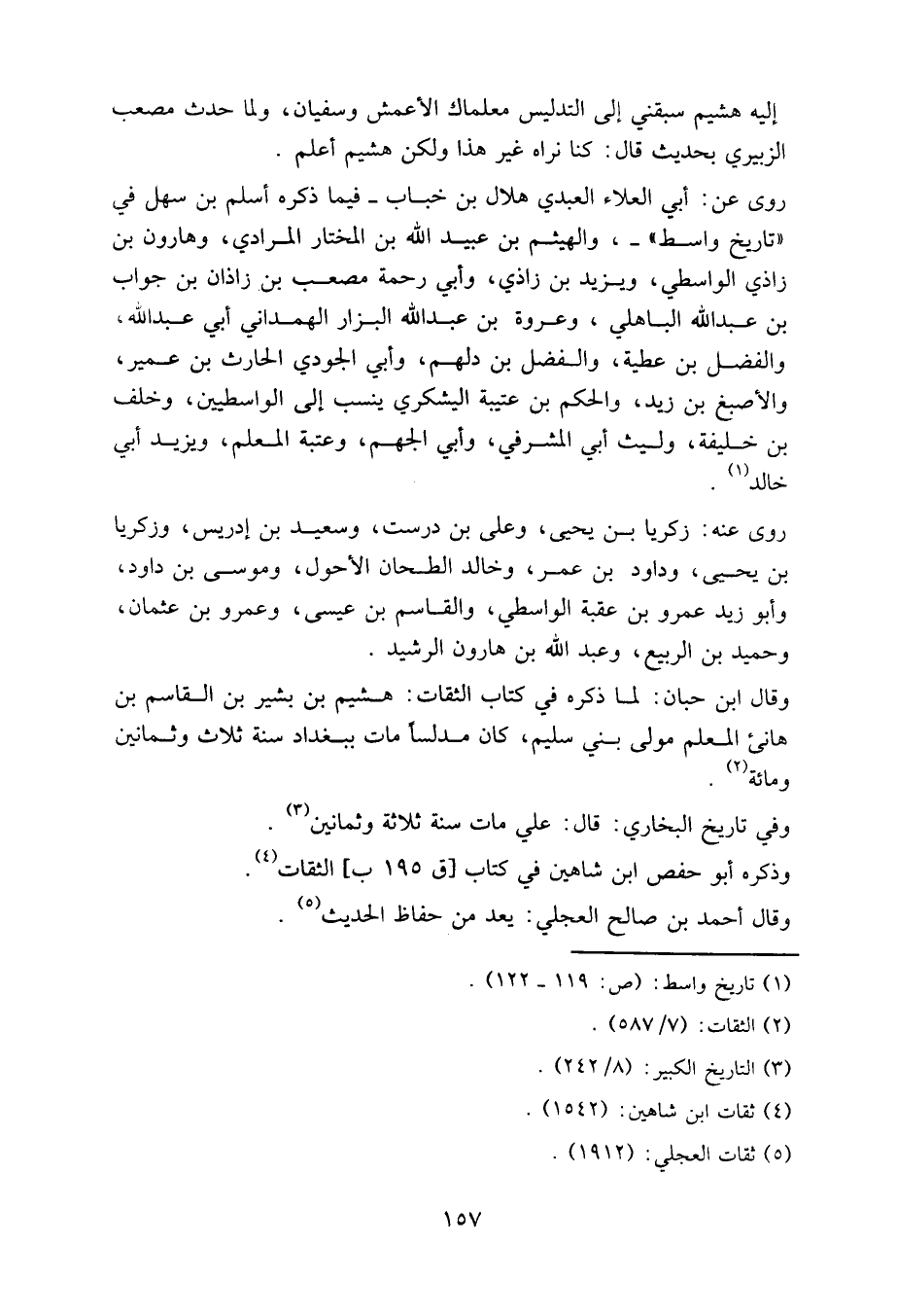 وقال ابن حبان لما ذكره في كتاب «الثقات»: هشيم بن بشير بن القاسم بن هانئ المعلم، مولى بني سليم، كان مدلسا، مات ببغداد سنة ثلاث وثمانين ومائة.
