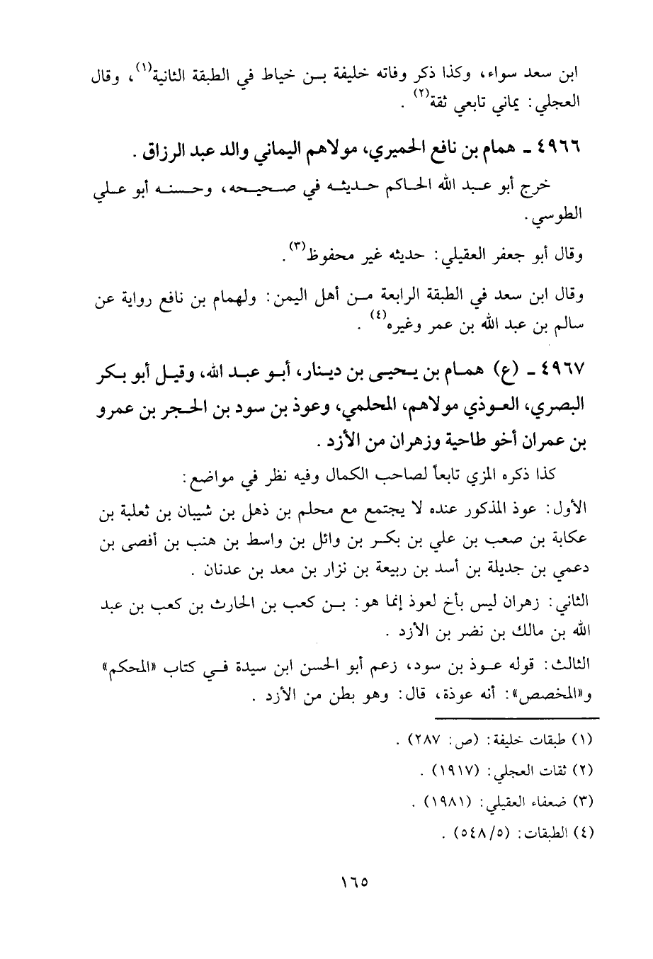 4967 - (ع) همام بن يحيى بن دينار، أبو عبد الله، وقيل: أبو بكر البصري، العوذي مولاهم، المحلمي، وعوذ بن سود بن الحجر بن عمرو بن عمران، أخو طاحية وزهران من الأزد.