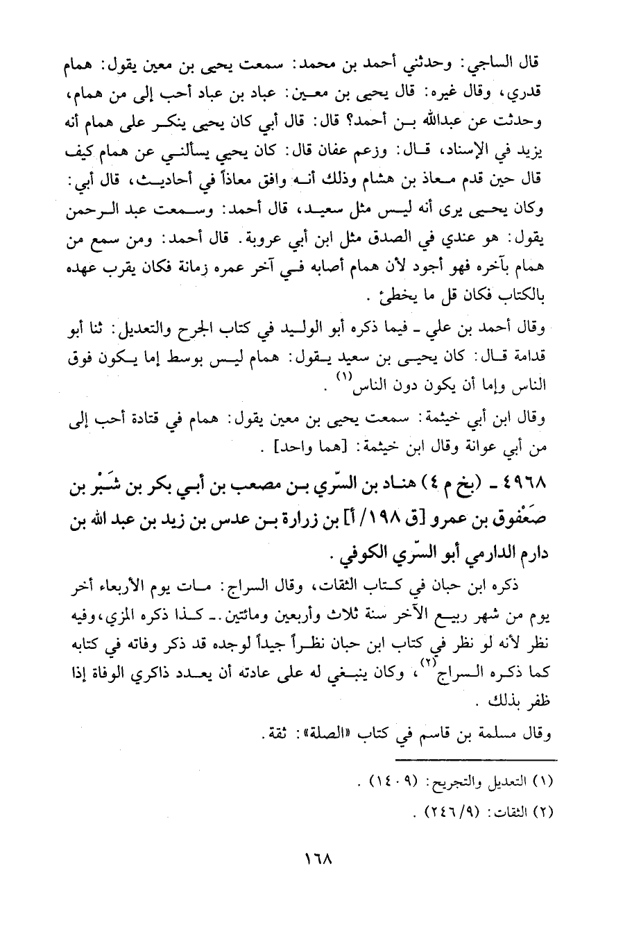 وقال أحمد بن علي – فيما ذكره أبو الوليد في كتاب الجرح والتعديل -: ثنا أبو قدامة قال: كان يحيى بن سعيد يقول: همام ليس بوسط، إما يكون فوق الناس، وإما أن يكون دون الناس.