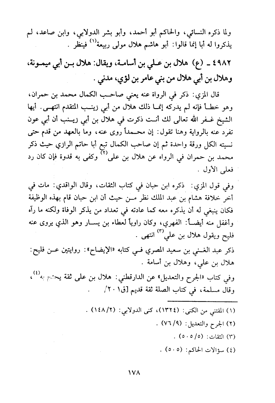 4982 - (ع) هلال بن علي بن أسامة، ويقال: هلال بن أبي ميمونة، وهلال بن أبي هلال من بني عامر بن لؤي، مدني.