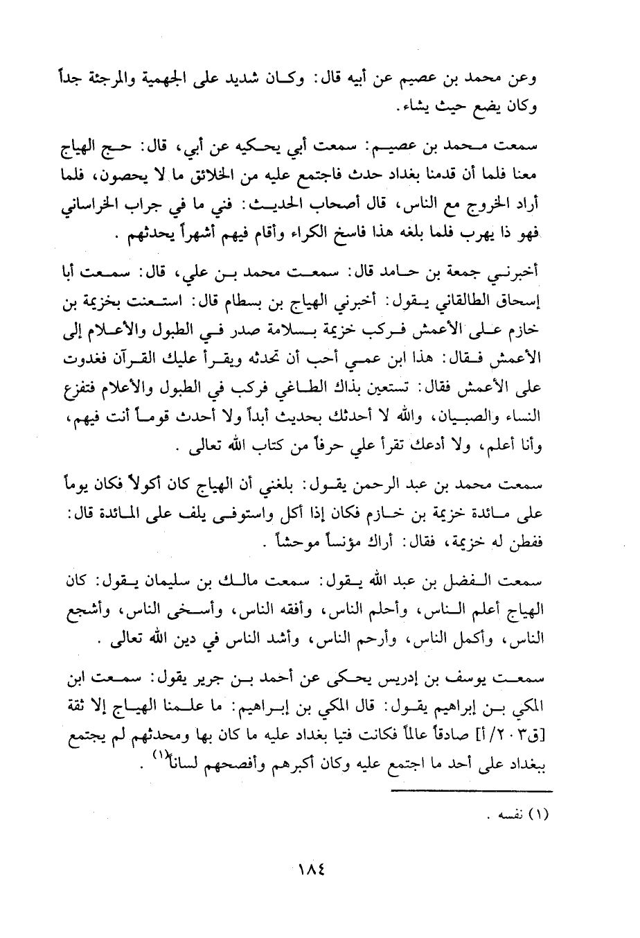 سمعت يوسف بن إدريس يحكي عن أحمد بن جرير يقول: سمعت ابن المكي بن إبراهيم يقول: قال المكي بن إبراهيم: ما علمنا الهياج إلا ثقة [ق203/أ] صادقا عالما، فكانت فتيا بغداد عليه ما كان بها، ومحدثهم لم يجتمع ببغداد على أحد ما اجتمع عليه، وكان أكبرهم وأفصحهم لسانا.