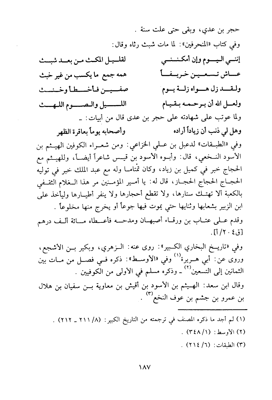 وفي «الطبقات» لدعبل بن علي الخزاعي: ومن شعراء الكوفين الهيثم بن الأسود النخعي، قال: وأبوه الأسود بن قيس شاعرا أيضا، وللهيثم بن الحجاج خبر في كميل بن زياد، وكان تمتاما، وله مع عبد الملك خبر في تولية الحجاج الحجاج الحجاز، قال له: يا أمير المؤمنين، مر هذا الغلام الثقفي بالكعبة ألا تهتك ستارها، ولا تقطع أحجارها، ولا ينفر أطيارها، وليأخذ على ابن الزبير بشعابها وثنايها حتى يموت فيها جوعا أو يخرج منها مخلوعا.
