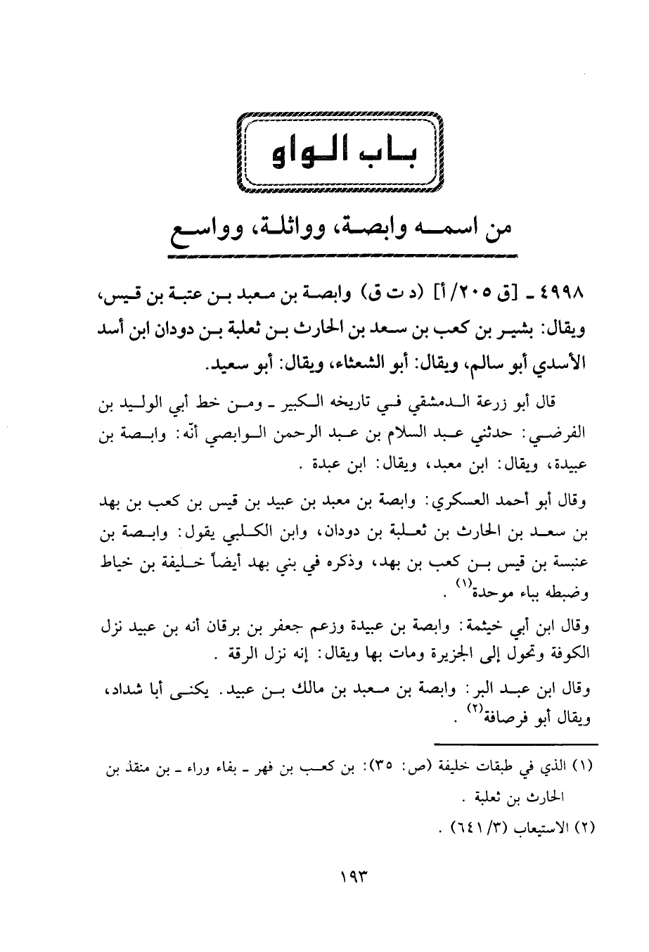 4998 - [ق205/أ] (د ت ق) وابصة بن معبد بن عتبة بن قيس، ويقال: بشير بن كعب بن سعد بن الحارث بن ثعلبة بن دودان ابن أسد الأسدي، أبو سالم، ويقال: أبو الشعثاء، ويقال: أبو سعيد.