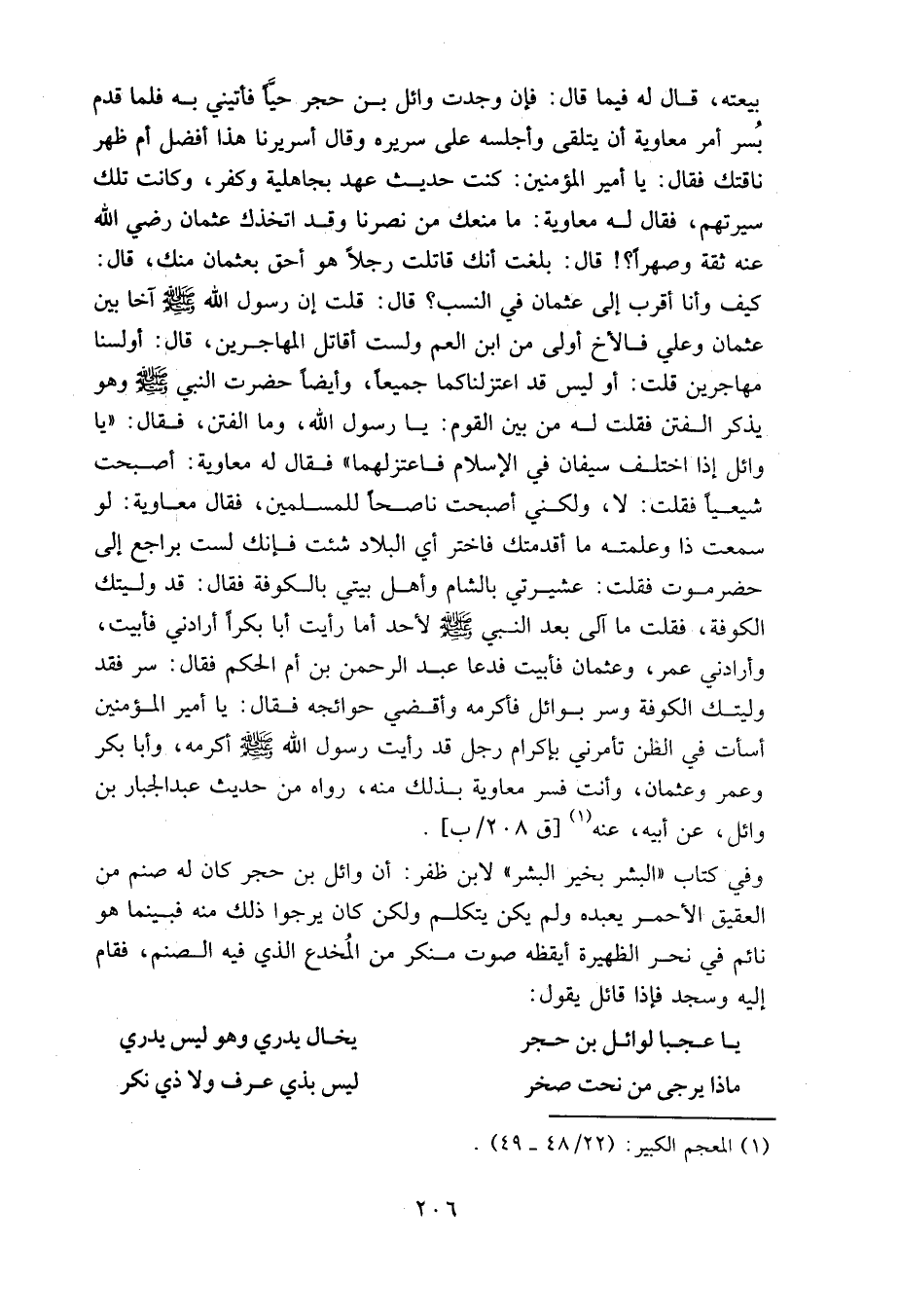 بيعته، قال له فيما قال: فإن وجدت وائل بن حجر حيا فأتني به، فلما قدم بسر أمر معاوية أن يتلقى، وأجلسه على سريره، وقال: أسريرنا هذا أفضل، أم ظهر ناقتك؟ فقال: يا أمير المؤمنين، كنت حديث عهد بجاهلية وكفر، وكانت تلك سيرتهم، فقال له معاوية: ما منعك من نصرنا وقد اتخذك عثمان رضي الله عنه ثقة وصهرا؟ قال: بلغت أنك قاتلت رجلا هو أحق بعثمان منك، قال: كيف وأنا أقرب إلى عثمان في النسب؟ قال: قلت: إن رسول الله - صلى الله عليه وسلم – آخى بين عثمان وعلي، فالأخ أولى من ابن العم، ولست أقاتل المهاجرين، قال: أولسنا مهاجرين؟ قلت: أو ليس قد اعتزلناكما جميعا؟ وأيضا حضرت النبي - صلى الله عليه وسلم – وهو يذكر الفتن، فقلت له من بين القوم: يا رسول الله، وما الفتن؟ فقال: يا وائل، إذا اختلف سيفان في الإسلام فاعتزلهما "، فقال له معاوية: أصبحت شيعيا؟ فقلت: لا، ولكني أصبحت ناصحا للمسلمين، فقال معاوية: لو سمعت ذا وعلمته ما أقدمتك، فاختر أي البلاد شئت، فإنك لست براجع إلى حضرموت، فقلت: عشيرتي بالشام وأهل بيتي بالكوفة، فقال: قد وليتك الكوفة، فقلت: ما ألي بعد النبي - صلى الله عليه وسلم – لأحد، أما رأيت أبا بكر أرادني فأبيت، وأرادني عمر وعثمان فأبيت؟ فدعا عبد الرحمن بن أم الحكم، فقال: سر، فقد وليتك الكوفة، وسر بوائل فأكرمه، وأقضي حوائجه فقال: يا أمير المؤمنين، أسأت في الظن، تأمرني بإكرام رجل قد رأيت رسول الله - صلى الله عليه وسلم - أكرمه، وأبا بكر وعمر وعثمان وأنت! فسر معاوية بذلك منه. رواه من حديث عبد الجبار بن وائل، عن أبيه، عنه [ق208/ب].
