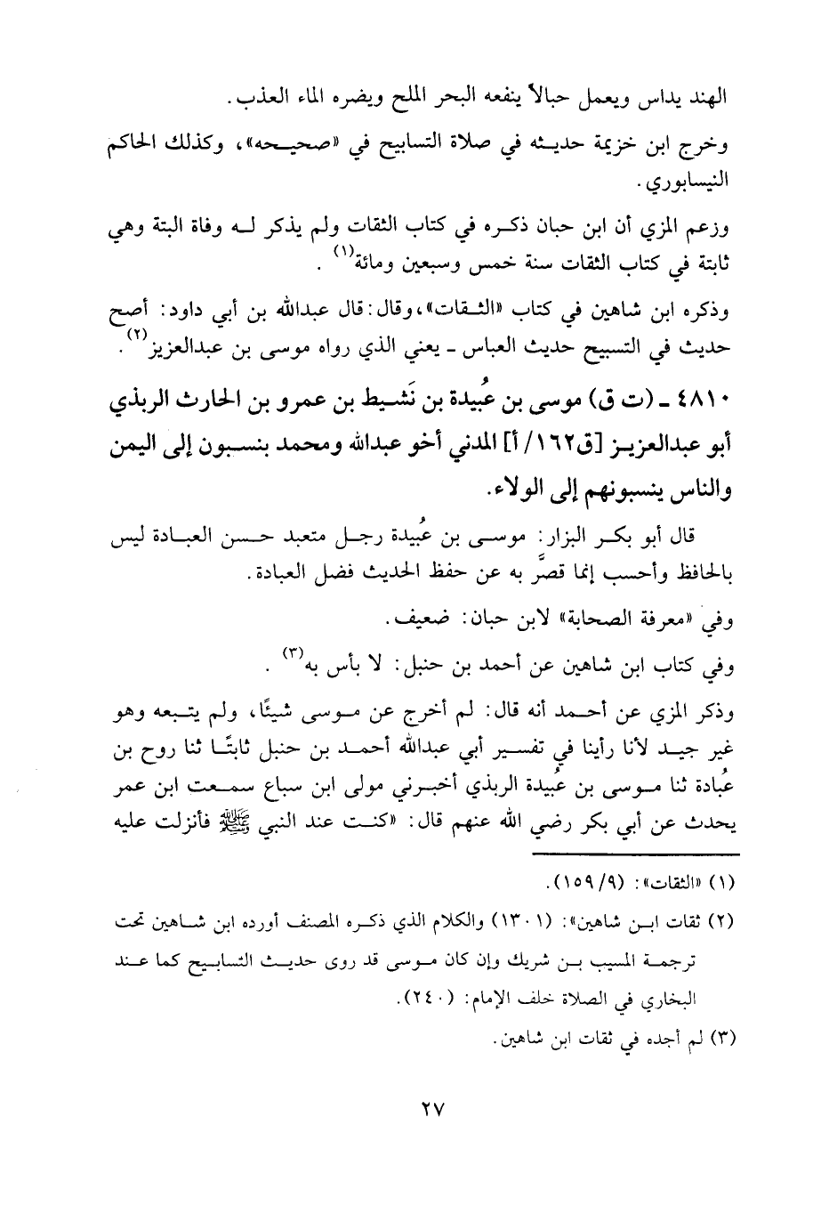 وذكره ابن شاهين في كتاب الثقات، وقال: قال عبد الله بن أبي داود: أصح حديث في التسبيح حديث العباس – يعني الذي رواه موسى بن عبد العزيز -.