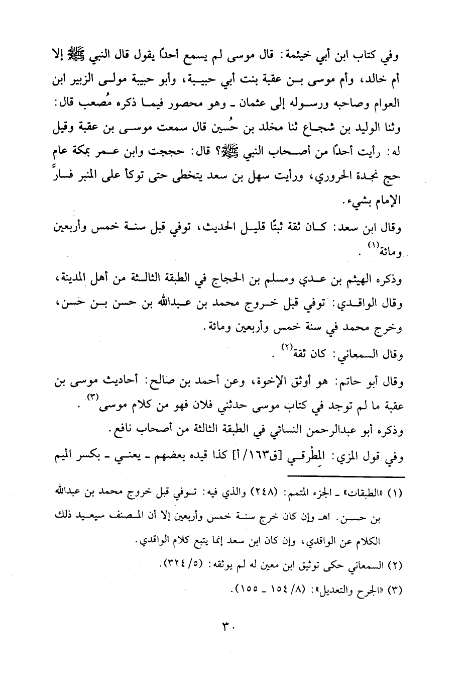 وفي كتاب ابن أبي خيثمة قال موسى لم يسمع أحدا يقول: قال النبي - صلى الله عليه وسلم – إلا أم خالد، وأم موسى بن عقبة بنت أبي حبيبة، وأبو حبيبة مولى الزبير ابن العوام وصاحبه ورسوله إلى عثمان – وهو محصور فيما ذكره مصعب - قال: وثنا الوليد بن شجاع، ثنا مخلد بن حسين قال: سمعت موسى بن عقبة وقيل له: رأيت أحدا من أصحاب النبي - صلى الله عليه وسلم -؟ قال: حججت وابن عمر بمكة عام حج نجدة الحروري، ورأيت سهل بن سعد يتخطى، حتى توكأ على المنبر فسار الإمام بشيء.
