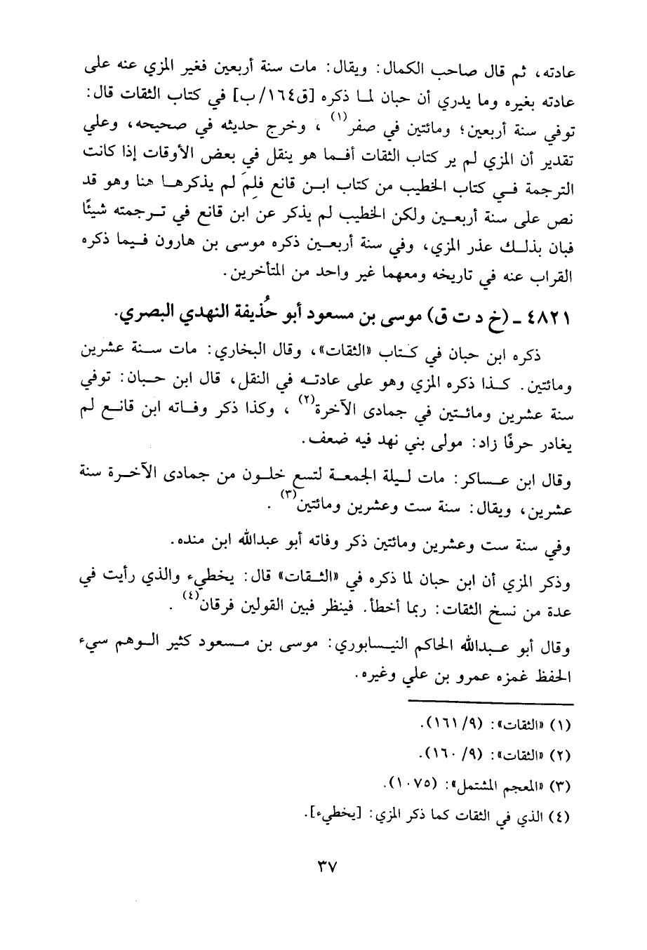 عادته، ثم قال صاحب الكمال: ويقال: مات سنة أربعين، فغير المزي عنه على عادته بغيره وما يدري أن حبان لما ذكره [ق164/ب] في كتاب الثقات قال: توفي سنة أربعين ومائتين في صفر، وخرج حديثه في صحيحه، وعلى تقدير أن المزي لم ير كتاب الثقات أفما هو ينقل في بعض الأوقات إذا كانت الترجمة في كتاب الخطيب من كتاب ابن قانع فلم لم يذكرها هنا وهو قد نص على سنة أربعين، ولكن الخطيب لم يذكر عن ابن قانع في ترجمته شيئا، فبان بذلك عذر المزي، وفي سنة أربعين ذكره موسى بن هارون فيما ذكره القراب عنه في تاريخه ومعهما غير واحد من المتأخرين.