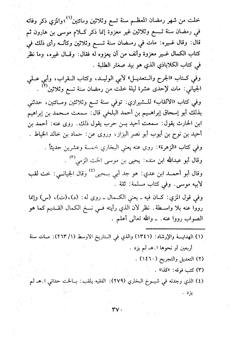 خلت من شهر رمضان المعظم سنة تسع وثلاثين ومائتين، والمزي ذكر وفاته في رمضان سنة تسع وثلاثين غير معزوة، إنما ذكر كلام موسى بن هارون ثم قال: وقال غيره: مات في رمضان سنة تسع وثلاثين، وكأنه رأى ذلك في كتاب الكمال غير معزوة وأنف من أن يعزوه له، فقال: وقال غيره، وما نظر في كتاب الكلاباذي الذي هو بيد صغار الطلبة.
