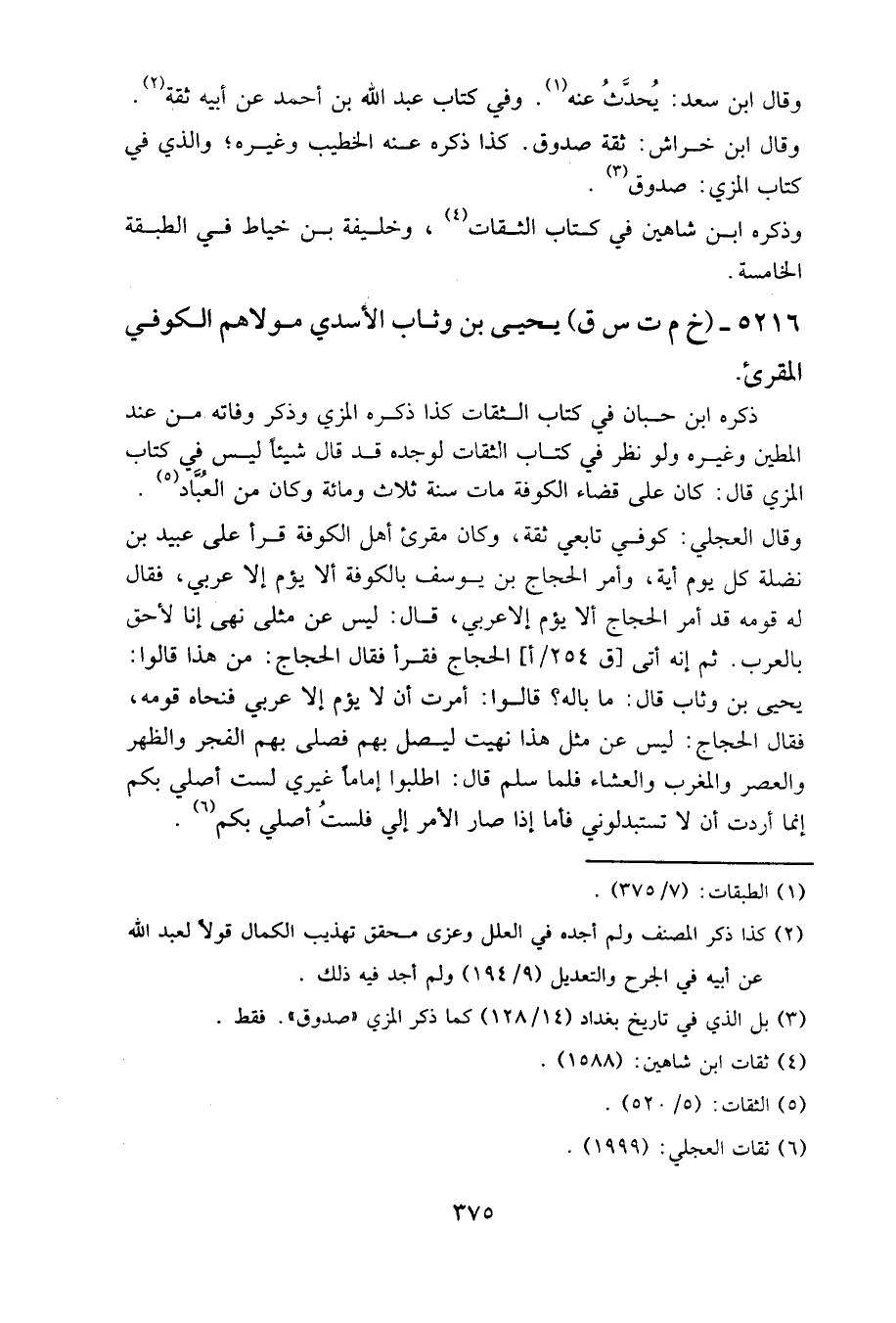 5216 - (خ م ت س ق) يحيى بن وثاب الأسدي مولاهم الكوفي المقرئ.