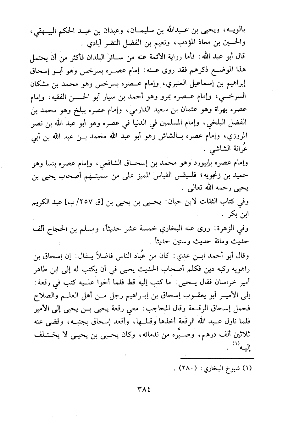 قال أبو عبد الله: فأما رواية الأئمة عنه من سائر البلدان فأكثر من أن يحتمل هذا الموضع ذكرهم، فقد روى عنه: إمام عصره بسرخس وهو أبو إسحاق بن إسماعيل العنبري، وإمام عصره بسرخس وهو محمد بن مشكان السرخسي، وإمام عصره بمرو وهو أحمد بن سيار أبو الحسن الفقيه، وإمام عصره بهراة وهو عثمان بن سعيد الدارمي، وإمام عصره ببلخ وهو محمد بن الفضل البلخي، وإمام المسلمين في الدنيا في عصره وهو أبو عبد الله بن نصر المروزي، وإمام عصره بالشاش وهو أبو عبد الله محمد بن عبد الله بن أبي عرانة الشاشي، وإمام عصره بإبيورد وهو محمد بن إسحاق الشافعي، وإمام عصره بنسا وهو حميد بن زنجويه؛ فليقس القياس المميز على من سيمتهم أصحاب يحيى بن يحيى رحمه الله تعالى.
