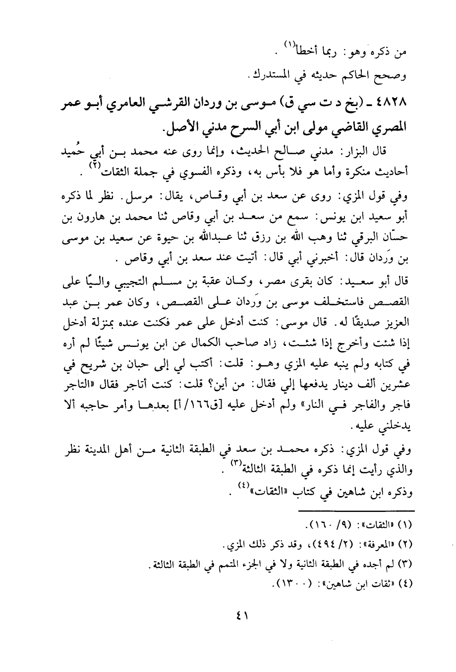 وفي قول المزي: ذكره محمد بن سعد في الطبقة الثانية من أهل المدينة؛ نظر، والذي رأيت إنما ذكره في الطبقة الثالثة.