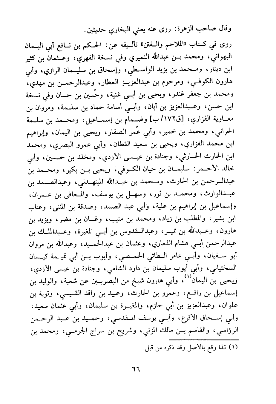 روى في كتاب «الملاحم والفتن» تأليفه عن: الحكم بن نافع أبي اليمان البهواني، ومحمد بن عبد الله النميري - وفي نسخة: الفهري -، وعثمان بن كثير بن دينار، ومحمد بن يزيد الواسطي، وإسحاق بن سليمان الرازي، وأبي هارون الكوفي، ومرحوم بن عبد العزيز العطار، وعبد الرحمن بن مهدي، ومحمد بن جعفر غندر، ويحيى بن أبي غنية، وحسين بن حسان - وفي نسخة: ابن حسن -، وعبد العزيز بن أبان، وأبي أسامة حماد بن سلمة، ومروان بن معاوية الفزاري، [ق172/ب] وضمام بن إسماعيل، ومحمد بن سلمة الحراني، ومحمد بن خمير، وأبي عمر الصفار، ويحيى بن اليمان، وإبراهيم بن محمد الفزاري، ويحيى بن سعيد القطان، وأبي عمرو البصري، ومحمد بن الحارث الحارثي، وجنادة بن عيسى الأزدي، ومخلد بن حسين، وأبي خالد الأحمر: سليمان بن حيان الكوفي، ويحيى بن بكير، ومحمد بن عبد الرحمن بن الحارث، ومحمد بن عبد الله الميتهدني، وعبد الصمد بن عبد الوارث، ومحمد بن ثور، وسهل بن يوسف، والمعافى بن عمران، وإسماعيل بن إبراهيم بن علية، وأبي عبد الصمد، وصدقة بن المثنى، وعتاب بن بشير، والمطلب بن زياد، ومحمد بن منيب، وغسان بن مضر، ويزيد بن هارون، وعبد الله بن نمير، وعبد القدوس بن أبي المغيرة، وعبد الملك بن عبد الرحمن أبي هشام الذماري، وعثمان بن عبد الحميد، وعبد الله بن مروان - أبو سفيان -، وأبي عامر الطائي الحمصي، وأيوب بن أبي تميمة كيسان السختياني، وأبي أيوب سليمان بن داود الشامي، وجنادة بن عيسى الأزدي، ويحيى بن اليمان، وأبي هارون - شيخ من البصريين - عن شعبة، والوليد بن إسماعيل بن رافع، وعمرو بن الحارث، وعبيد بن واقد القيسي، وتوبة بن علوان، وعبد العزيز بن أبي حازم، والمغيرة بن سليمان، وأبي عثمان سعيد، وأبي إسحاق الأقرع، وأبي يوسف المقدسي، وحميد بن عبد الرحمن الرؤاسي، والقاسم بن مالك المزني، وشريح بن سراج الجرمي، ومحمد بن