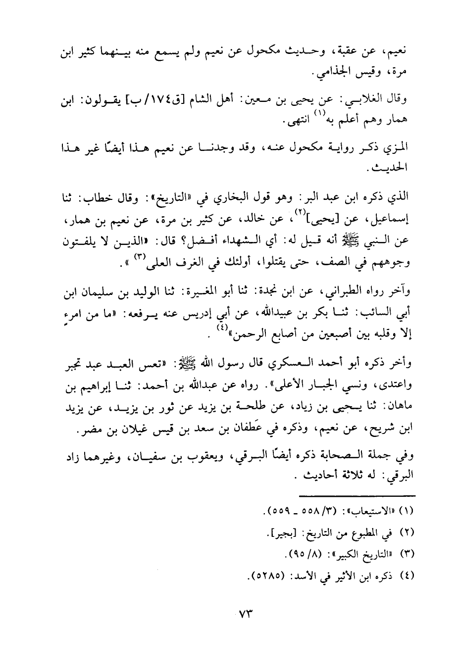 المزي ذكر رواية مكحول عنه، وقد وجدنا عن نعيم هذا - أيضا - غير هذا الحديث الذي ذكره ابن عبد البر: وهو قول البخاري في «التاريخ»: وقال خطاب: ثنا إسماعيل، عن [يحيى]، عن خالد، عن كثير بن مرة، عن نعيم بن همار، عن النبي - صلى الله عليه وسلم – أنه قيل له: أي الشهداء أفضل؟ قال: " الذين لا يلفتون وجوههم في الصف، حتى يقتلوا، أولئك في الغرف العلى ".