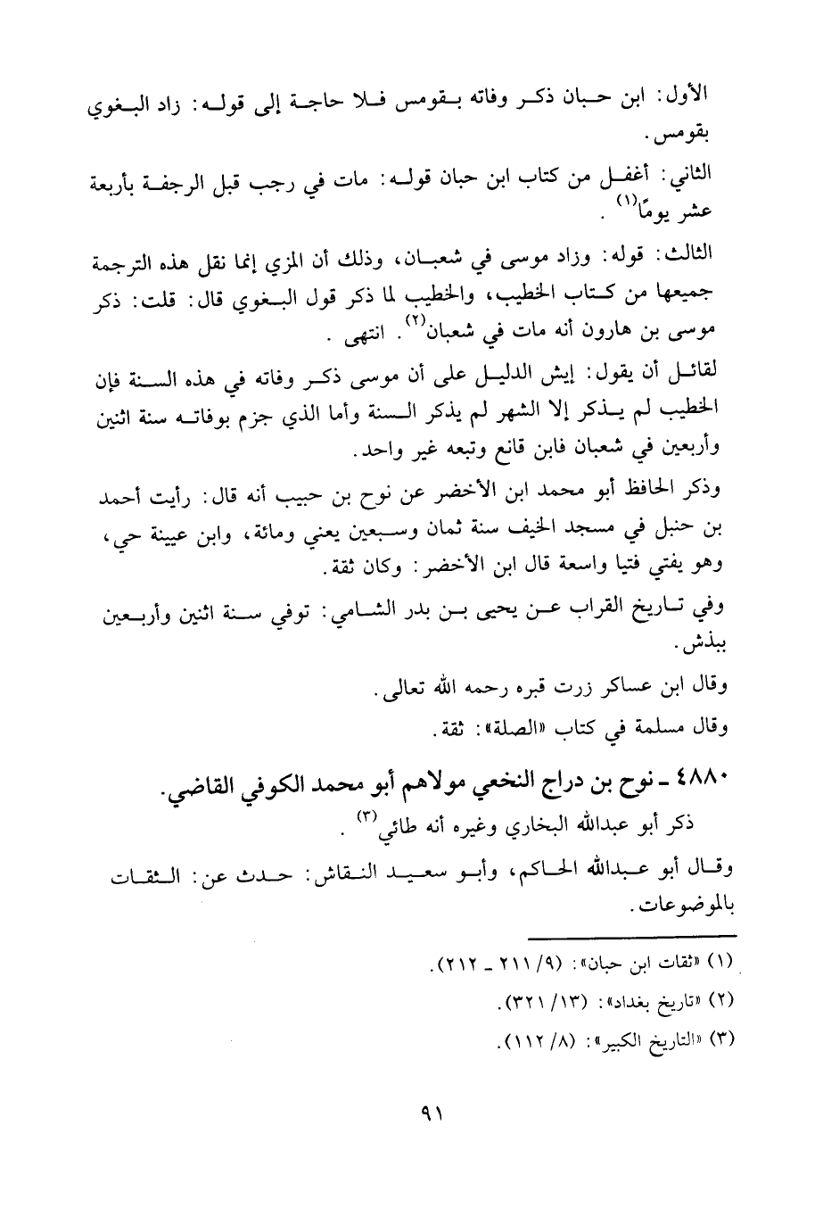 الثالث: قوله: وزاد موسى: في شعبان؛ وذلك أن المزي إنما نقل هذه الترجمة جميعها من كتاب الخطيب، والخطيب لما ذكر قول البغوي قال: قلت: ذكر موسى بن هارون أنه مات في شعبان. انتهى.