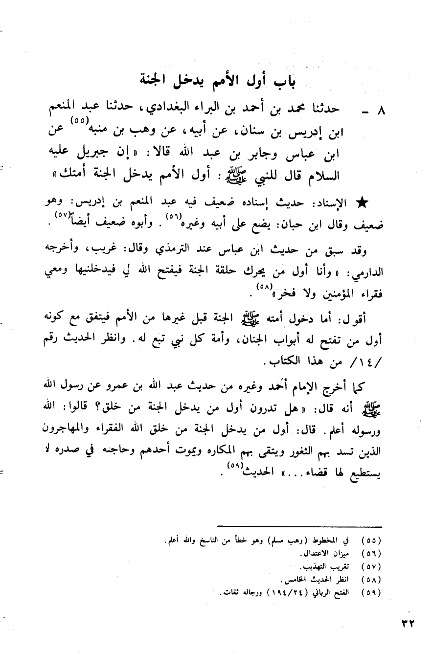 8 - حَدَّثَنَا مُحَمَّدُ بْنُ أَحْمَدَ بْنِ الْبَرَاءِ الْبَغْدَادِيُّ، حَدَّثَنَا عَبْدُ الْمُنْعِمِ بْنُ إِدْرِيسَ بْنِ سِنَانٍ، عَنْ أَبِيهِ، عَنْ وَهْبِ بْنِ مُنَبِّهٍ، عَنِ ابْنِ عَبَّاسٍ، وَجَابِرِ بْنِ عَبْدِ اللَّهِ، قَالَا: إِنَّ جِبْرِيلَ - عَلَيْهِ السَّلَامُ - قَالَ لِلنَّبِيِّ صَلَّى اللهُ عَلَيْهِ وَسَلَّمَ: «§أَوَّلُ الْأُمَمِ يَدْخُلُ الْجَنَّةَ أُمَّتُكَ»