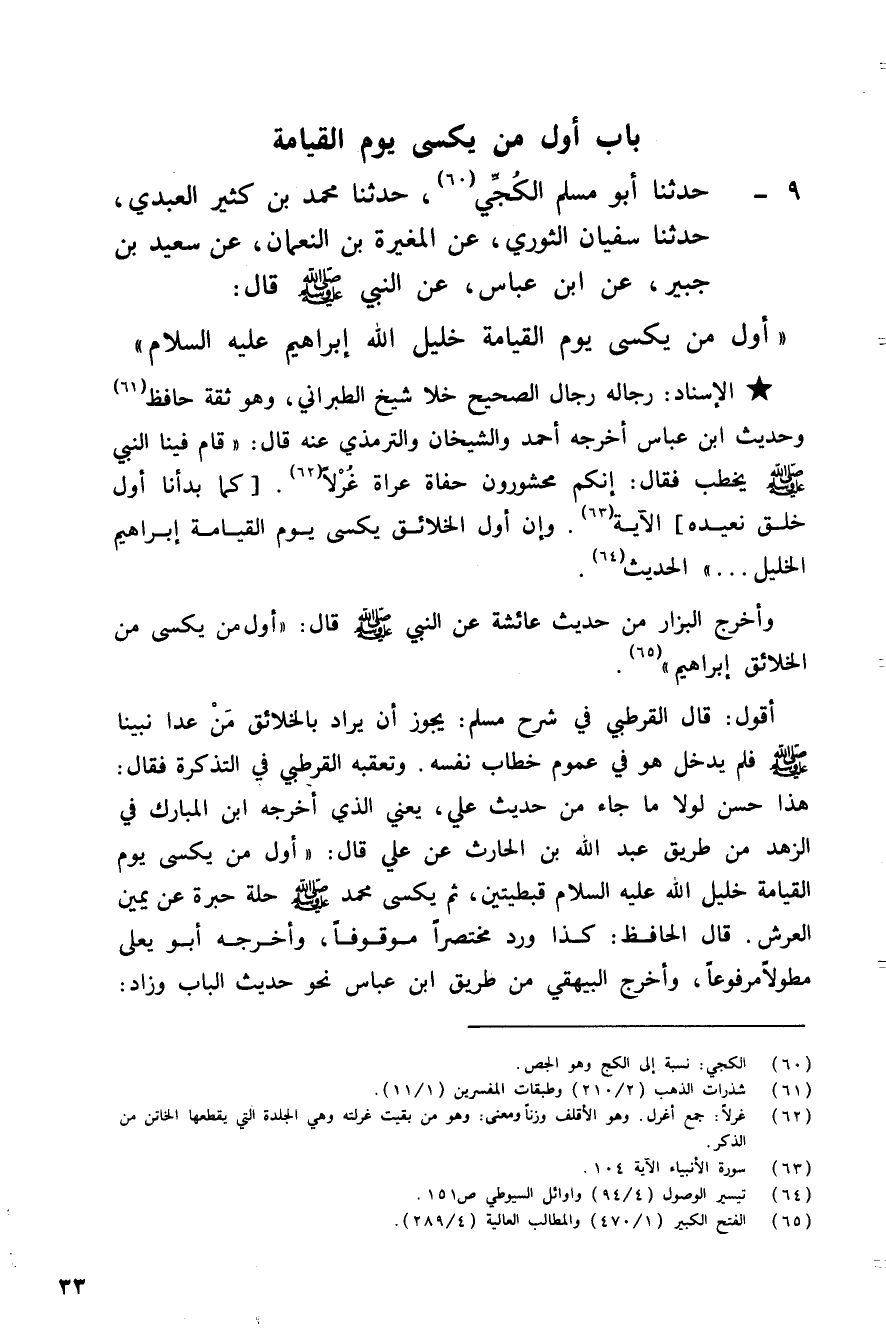 9 - حَدَّثَنَا أَبُو مُسْلِمٍ الْكَجِّيُّ، حَدَّثَنَا مُحَمَّدُ بْنُ كَثِيرٍ الْعَبْدِيُّ، حَدَّثَنَا سُفْيَانُ الثَّوْرِيُّ، عَنِ الْمُغِيرَةِ بْنِ النُّعْمَانِ، عَنْ سَعِيدِ بْنِ جُبَيْرٍ، عَنِ ابْنِ عَبَّاسٍ عَنِ النَّبِيِّ صَلَّى اللهُ عَلَيْهِ وَسَلَّمَ قَالَ: «§أَوَّلُ مَنْ يُكْسَى يَوْمَ الْقِيَامَةِ خَلِيلُ اللَّهِ إِبْرَاهِيمُ عَلَيْهِ السَّلَامُ»