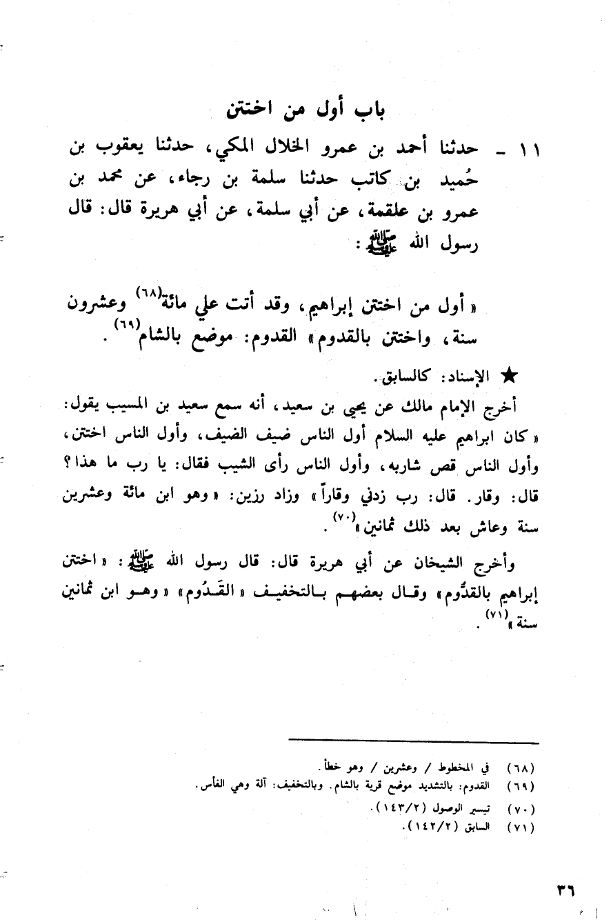 11 - حَدَّثَنَا أَحْمَدُ بْنُ عَمْرٍو الْخَلَّالُ الْمَكِّيُّ، حَدَّثَنَا يَعْقُوبُ بْنُ حُمَيْدِ بْنِ كَاسِبٍ، حَدَّثَنَا سَلَمَةُ بْنُ رَجَاءٍ، عَنْ مُحَمَّدِ بْنِ عَمْرِو بْنِ عَلْقَمَةَ، عَنْ أَبِي سَلَمَةَ، عَنْ أَبِي هُرَيْرَةَ قَالَ: قَالَ رَسُولُ اللَّهِ صَلَّى اللهُ عَلَيْهِ وَسَلَّمَ: «§أَوَّلُ مَنِ اخْتُتِنَ إِبْرَاهِيمُ وَقَدْ أَتَتْ عَلَيْهِ مِائَةٌ وَعِشْرُونَ سَنَةً وَاخْتُتِنَ بِالْقَدُومِ» . الْقُدُومُ: مَوْضِعٌ بِالشَّامِ