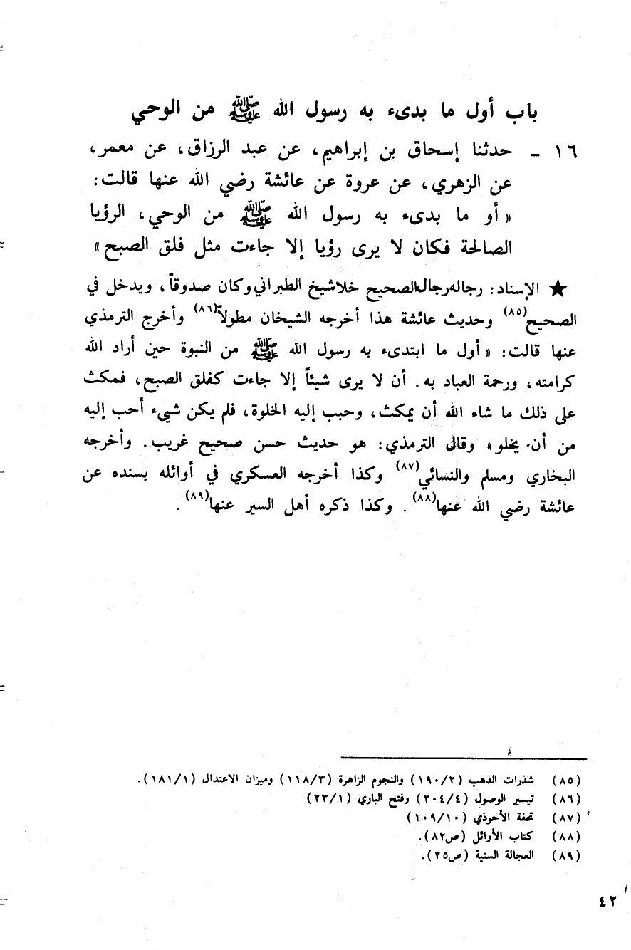 16 - حَدَّثَنَا إِسْحَاقُ بْنُ إِبْرَاهِيمَ، عَنْ عَبْدِ الرَّزَّاقِ، عَنْ مَعْمَرٍ، عَنِ الزُّهْرِيِّ، عَنْ عُرْوَةَ، عَنْ عَائِشَةَ رَضِيَ اللَّهُ عَنْهَا قَالَتْ: «§أَوَّلُ مَا بُدِئَ بِهِ رَسُولُ اللَّهِ صَلَّى اللهُ عَلَيْهِ وَسَلَّمَ مِنَ الْوَحْي الرُّؤْيَةُ الصَّادِقَةُ فَكَانَ لَا يَرَى رُؤْيَا إِلَّا جَاءَتْ مِثْلَ فَلَقِ الصُّبْحِ»