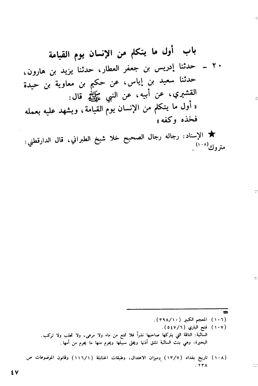 20 - حَدَّثَنَا إِدْرِيسُ بْنُ جَعْفَرٍ الْعَطَّارُ، حَدَّثَنَا يَزِيدُ بْنُ هَارُونَ، حَدَّثَنَا سَعِيدُ بْنُ إِيَاسَ، عَنْ حَكِيمِ بْنِ مُعَاوِيَةَ بْنِ حَيْدَةَ الْقُشَيْرِيِّ، عَنْ أَبِيهِ، عَنِ النَّبِيِّ صَلَّى اللهُ عَلَيْهِ وَسَلَّمَ قَالَ: «§أَوَّلُ مَا يَتَكَلَّمُ مِنَ الْإِنْسَانِ يَوْمَ الْقِيَامَةِ، وَيَشْهَدُ عَلَيْهِ بِعَمَلِهِ فَخِذُهُ وَكَفُّهُ»