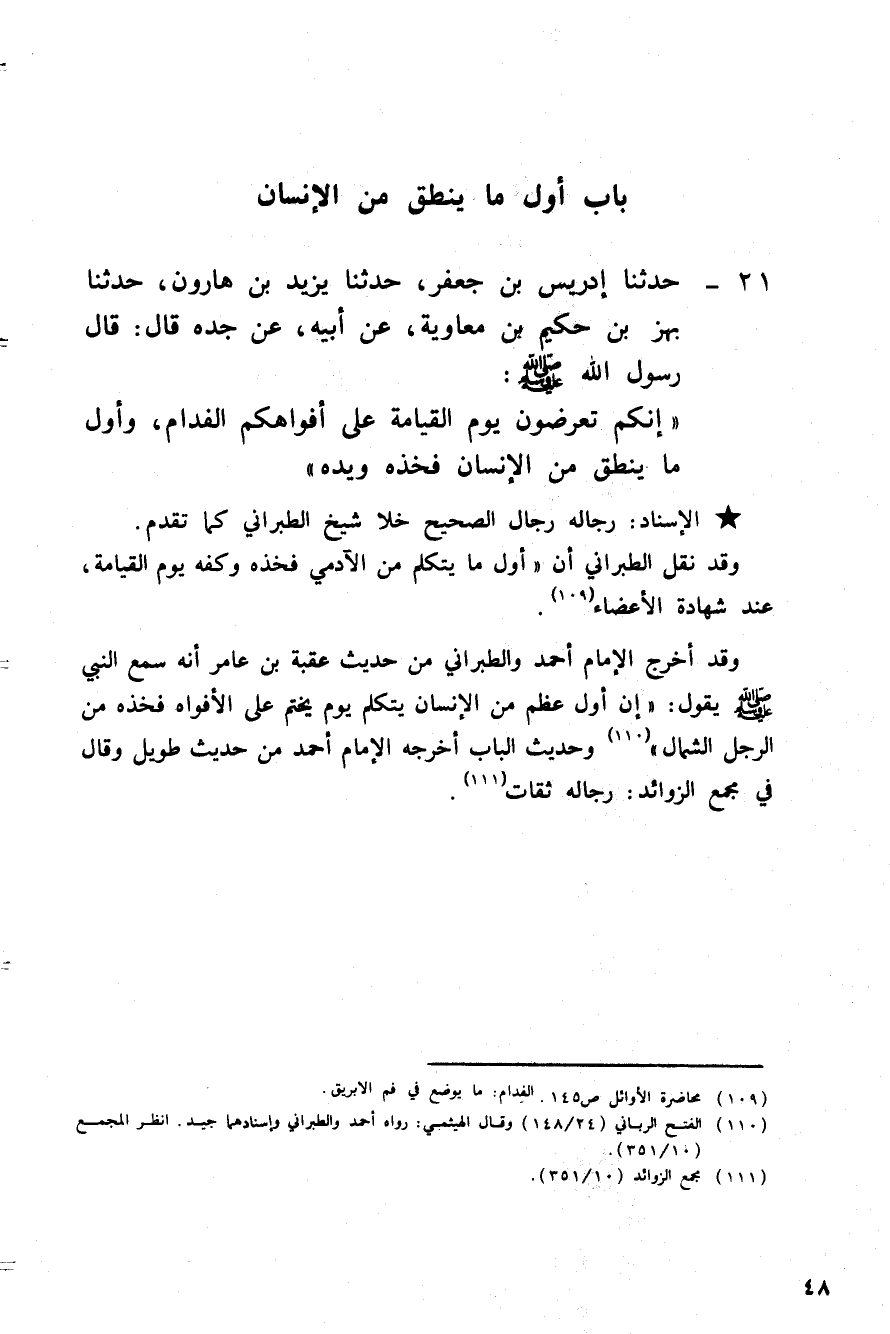 21 - حَدَّثَنَا إِدْرِيسُ بْنُ جَعْفَرٍ، حَدَّثَنَا يَزِيدُ بْنُ هَارُونَ، حَدَّثَنَا بَهْزُ بْنُ حَكِيمِ بْنِ مُعَاوِيَةَ، عَنْ أَبِيهِ، عَنْ جَدِّهِ قَالَ: قَالَ رَسُولُ اللَّهِ صَلَّى اللهُ عَلَيْهِ وَسَلَّمَ: «§إِنَّكُمْ تُعْرَضُونَ يَوْمَ الْقِيَامَةِ عَلَى أَفْوَاهِكُمُ الْفِدَامُ وَأَوَّلُ مَا يَنْطِقُ مِنَ الْإِنْسَانِ فَخِذُهُ وَيَدُهُ»