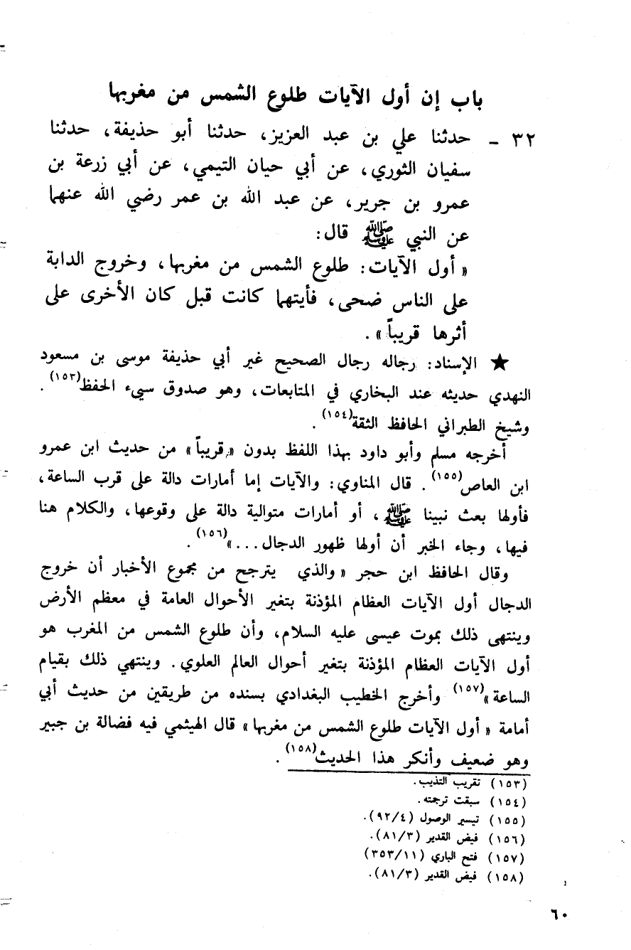 32 - حَدَّثَنَا عَلِيُّ بْنُ عَبْدِ الْعَزِيزِ، حَدَّثَنَا أَبُو حُذَيْفَةَ، حَدَّثَنَا سُفْيَانُ الثَّوْرِيُّ، عَنْ أَبِي حَيَّانَ التَّيْمِيِّ، عَنْ أَبِي زُرْعَةَ بْنِ عَمْرِو بْنِ جَرِيرٍ، عَنْ عَبْدِ اللَّهِ بْنِ عُمَرَ رَضِيَ اللَّهُ عَنْهُمَا: عَنِ النَّبِيِّ صَلَّى اللهُ عَلَيْهِ وَسَلَّمَ قَالَ: " §أَوَّلُ الْآيَاتِ: طُلُوعُ الشَّمْسِ مِنْ مَغْرِبِهَا وَخُرُوجُ الدَّابَّةِ عَلَى النَّاسِ ضُحًى فَأَيَّتُهُمَا كَانَتْ قَبْلُ كَانَتِ الْأُخْرَى عَلَى أَثَرِهَا قَرِيبًا "