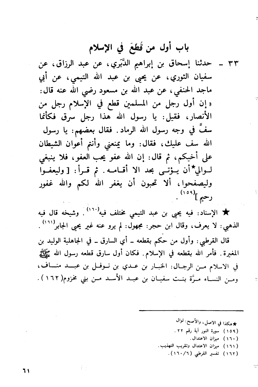 33 - حَدَّثَنَا إِسْحَاقُ بْنُ إِبْرَاهِيمَ الدَّبَرِيُّ، عَنْ عَبْدِ الرَّزَّاقِ، عَنْ سُفْيَانَ الثَّوْرِيِّ، عَنْ يَحْيَى بْنِ عَبْدِ اللَّهِ التَّيْمِيِّ، عَنْ أَبِي مَاجِدٍ الْحَنَفِيِّ، عَنْ عَبْدِ اللَّهِ بْنِ مَسْعُودٍ رَضِيَ اللَّهُ عَنْهُ قَالَ: إِنَّ أَوَّلَ رَجُلٍ مِنَ الْمُسْلِمِينَ قُطِعَ فِي الْإِسْلَامِ رَجُلٌ مِنَ الْأَنْصَارِ فَقِيلَ: يَا رَسُولَ اللَّهِ هَذَا سَرَقَ فَكَأَنَّمَا سُفَّ فِي وَجْهِ رَسُولِ اللَّهِ الرَّمَادُ. فَقَالَ بَعْضُهُمْ: يَا رَسُولَ اللَّهِ سُفَّ عَلَيْكَ فَقَالَ: " وَمَا يَمْنَعُنِي وَأَنْتُمْ أَعْوَانُ الشَّيْطَانِ عَلَى أَخِيكُمْ ثُمَّ قَالَ: §إِنَّ اللَّهَ عَفُوٌّ يُحِبُّ الْعَفْوَ فَلَا يَنْبَغِي لِوَالٍ أَنْ يُؤْتَى بِحَدٍّ إِلَّا أَقَامَهُ. ثُمَّ قَرَأَ {وَلْيَعْفُوا وَلْيَصْفَحُوا، أَلَا تُحِبُّونَ أَنْ يَغْفِرَ اللَّهُ لَكُمْ وَاللَهُ غَفُورٌ رَحِيمٌ} [النور: 22] "