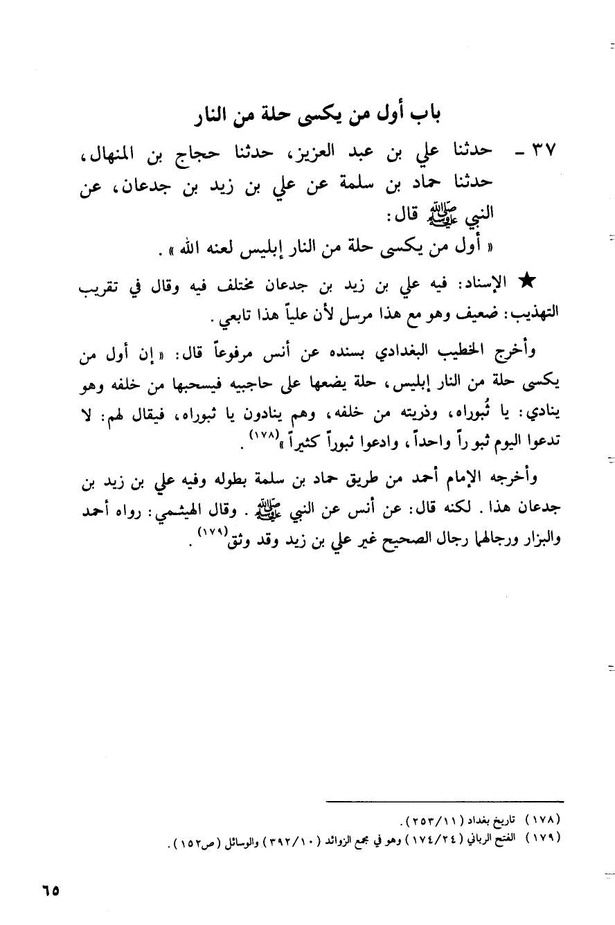 37 - حَدَّثَنَا عَلِيُّ بْنُ عَبْدِ الْعَزِيزِ، حَدَّثَنَا حَجَّاجُ بْنُ الْمِنْهَالِ، حَدَّثَنَا حَمَّادُ بْنُ سَلَمَةَ، عَنْ عَلِيِّ بْنِ زَيْدِ بْنِ جُدْعَانَ: عَنِ النَّبِيِّ صَلَّى اللهُ عَلَيْهِ وَسَلَّمَ قَالَ: «§أَوَّلُ مَنْ يُكْسَى حُلَّةً مِنَ النَّارِ إِبْلِيسُ لَعَنَهُ اللَّهُ»