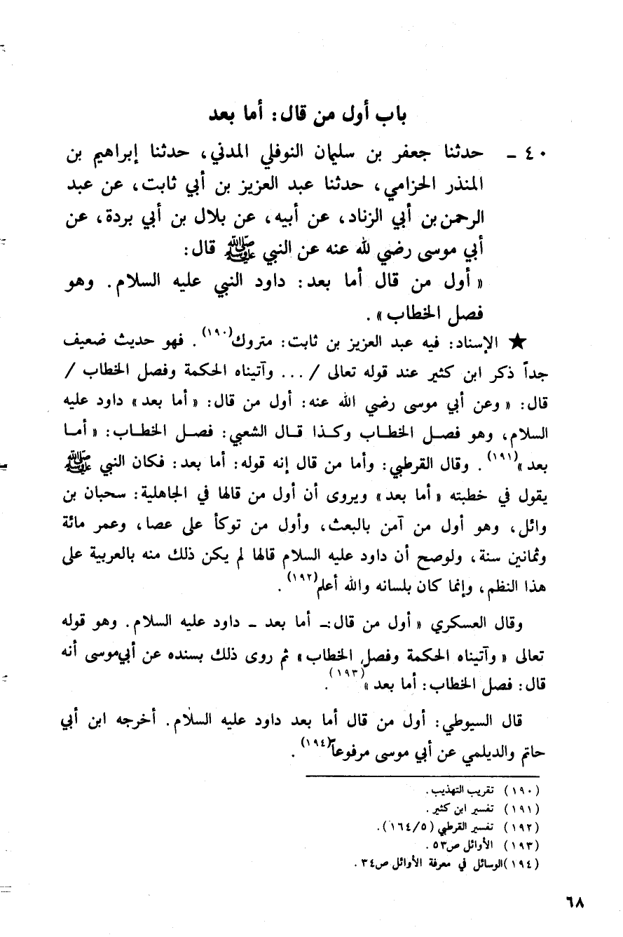 40 - حَدَّثَنَا جَعْفَرُ بْنُ سُلَيْمَانَ النَّوْفَلِيُّ الْمَدَنِيُّ، حَدَّثَنَا إِبْرَاهِيمُ بْنُ الْمُنْذِرِ الْحِزَامِيُّ، حَدَّثَنَا عَبْدُ الْعَزِيزِ بْنُ أَبِي ثَابِتٍ، عَنْ عَبْدِ الرَّحْمَنِ بْنِ أَبِي الزِّنَادِ، عَنْ أَبِيهِ، عَنْ بِلَالِ بْنِ أَبِي بُرْدَةَ، عَنْ أَبِي بُرْدَةَ، عَنْ أَبِي مُوسَى رَضِيَ اللَّهُ عَنْهُ: عَنِ النَّبِيِّ صَلَّى اللهُ عَلَيْهِ وَسَلَّمَ قَالَ: " §أَوَّلُ مَنْ قَالَ: أَمَّا بَعْدُ: دَاوُدُ النَّبِيُّ عَلَيْهِ السَّلَامُ. وَهُوَ فَصْلُ الْخِطَابِ "