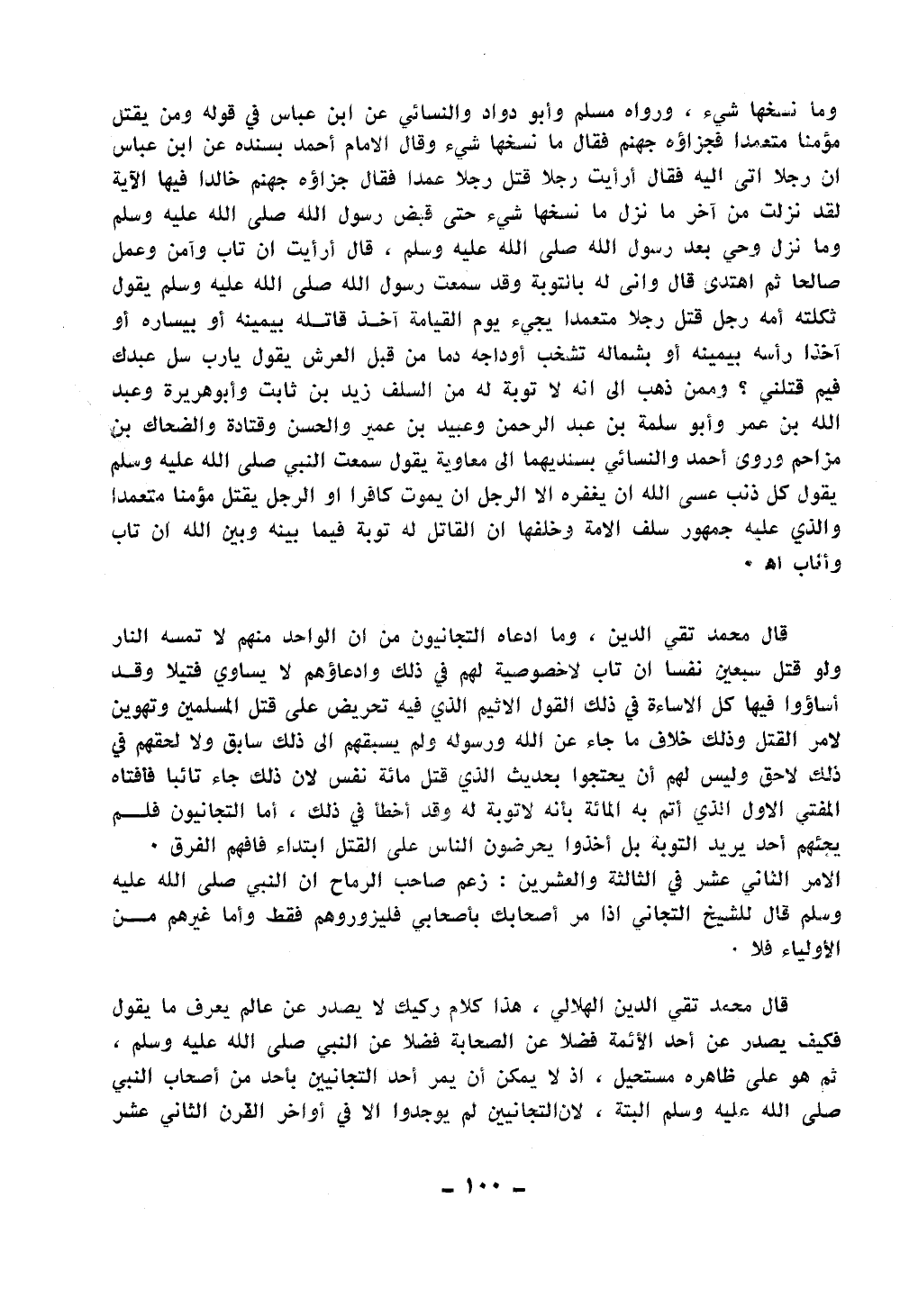 قال محمد تقي الدين: وما ادعاه التجانيون من أن الواحد منهم لا تمسه النار ولو قتل سبعين نفسا إن تاب لا خصوصية لهم في ذلك وادعاؤهم لا يساوي فتيلا وقد أساؤوا فيها كل الإساءة في ذلك القول الأثيم الذي فيه تحريض على قتل المسلمين وتهوين لأمر القتل وذلك خلاف ما جاء عن الله ورسوله ولم يسبقهم إلى ذلك سابق ولا لحقهم في ذلك لاحق وليس لهم أن يحتجوا بحديث الذي قتل مائة نفس لأن ذلك جاء تائبا فأفتاه المفتي الأول الذي أتم به المائة بأنة لا توبة له وقد اخطأ في ذلك؛ أما التجانيون فلم يجئهم أحد يريد التوبة بل أخذوا يحرضون الناس على القتل ابتداء فافهم الفرق.