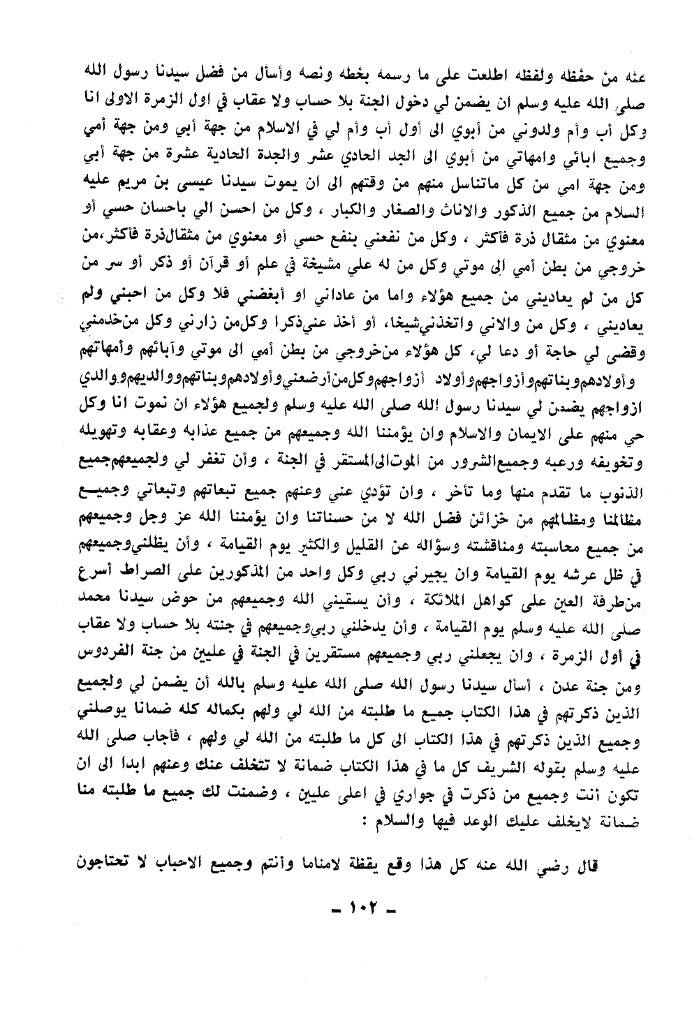عنه من حفظه ولفظه اطلعت على ما رسمه بخطه ونصه وأسأل من فضل سيدنا رسول الله صلى الله عليه وسلم أن يضمن لي دخول الجنة بلا حساب ولا عذاب في أول الزمرة الأولى أنا وكل أب وأم ولدوني من أبوي إلى أول أب لي في الإسلام من جهة أبي ومن جهة أمي وجميع آبائي وأمهاتي من أبوي إلى الجد الحادي عشر والجدة الحادية عشرة من جهة أبي ومن جهة أمي من كل ما تناسل منهم من وقتهم إلى أن يموت سيدنا عيسى بن مريم عليه السلام من جميع الذكور والإناث والصغار والكبار؛ وكل من أحسن إلي بإحسان حسي أو معنوي من مثقال ذرة فأكثر؛ وكل من نفعني بنفع حسي أو معنوي من مثقال ذرة فاكثر؛ من خروجي من بطن أمي إلى موتي وكل من له علي مشيخة في علم أو قرآن أو ذكر أو سر من كل من لم يعاديني من جميع هؤلاء وأما من عاداني أو أبغضني فلا وكل من أحبني ولم يعاديني؛ وكل من والاني واتخذني شيخا؛ أو أخذ عني ذكرا وكل من زارني وكل من خدمني وقضى لي حاجة أو دعا لي؛ كل هؤلاء من خروجي من بطن أمي إلى موتي وآبائهم وأمهاتهم وأولادهم وبناتهم وأزواجهم وأولاد أزواجهم وكل من أرضعني وأولادهم وبناتهم ووالديهم ووالدي أزواجهم يضمن لي سيد الوجود رسول الله صلى الله عليه وسلم ولجميع هؤلاء أن نموت أنا وكل حي منهم على الإيمان والإسلام وأن يؤمننا الله وجميعهم من جميع عذابه وعقابه وتهويله وتخويفه ورعبه وجميع الشرور من الموت إلى المستقر في الجنة؛ وأن تُغفر لي ولجميعهم جميع الذنوب ما