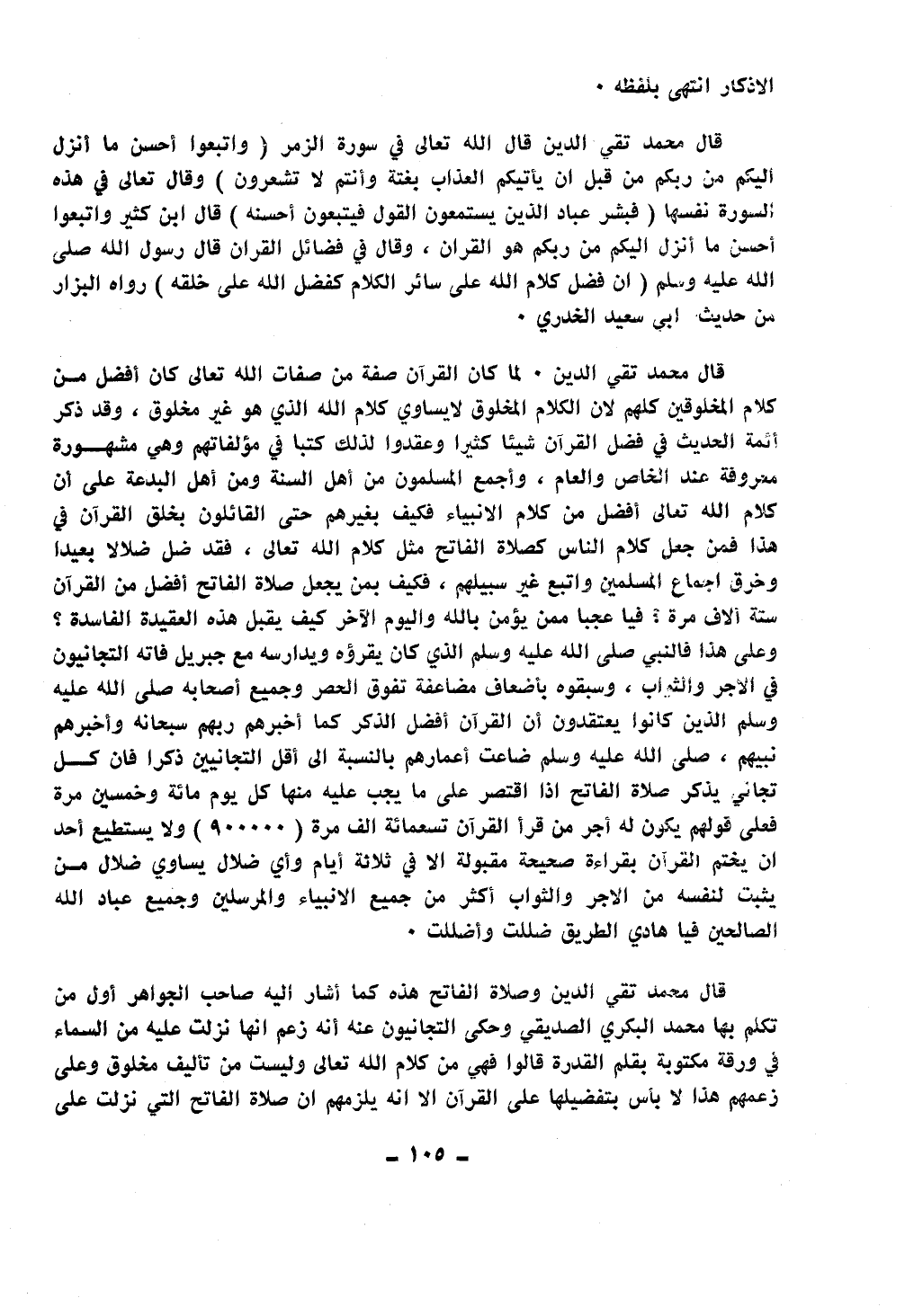قال محمد تقي الدين: لما كان القرآن صفة من صفات الله كان أفضل من كلام المخلوقين كلهم لأن الكلام المخلوق لا يساوي كلام الله الذي هو غير مخلوق. وقد ذكر أئمة الحديث في فضائل القرآن شيئا كثيرا وعقدوا لذلك كتبا في مؤلفاتهم وهي مشهورة معروفة عند الخاص والعام، وأجمع المسلمون من أهل السنة ومن أهل البدعة على أن كلام الله تعالى أفضل من كلام الأنبياء فكيف بغيرهم حتى القائلون بخلق القرآن في هذا فمن جعل كلام الناس كصلاة الفاتح مثل كلام الله تعالى فقد ضل ضلالا بعيدا وخرق إجماع المسلمين واتبع غير سبيلهم فكيف بمن يجعل صلاة الفاتح أفضل من القرآن بستة آلاف مرة فيا عجبا ممن يؤمن بالله واليوم الآخر كيف يؤمن بهذه العقيد الفاسدة؟ وعلى هذا فالنبي صلى الله عليه وسلم الذي كان يقرأه ويدارسه مع جبريل فاته التجانيون في الأجر والثواب وسبقوه بأضعاف مضاعفة تفوق الحصر وجميع أصحابه صلى الله عليه وسلم الذي كانوا يعتقدون أن القرآن أفضل الأذكار كما أخبرهم ربهم سبحانه وأخبرهم نبيهم صلى الله عليه وسلم ضاعت أعمارهم بالنسبة إلى أقل التجانيين ذكرا فإن كل تجاني يذكر صلاة الفاتح إذا اقتصر على ما يجب عليه منها كل يوم مائة وخمسين مرة فعلى قولهم يكون له أجر من قرأ القرآن تسع مائة ألف مرة (900000) ولا يستطيع أحد أن يختم القرآن بقراءة صحيحة مقبولة إلا في ثلاثة أيام وأي ضلال يساوي ضلال من يثبت لنفسه من الأجر والثواب أكثر من جميع الأنبياء والمرسلين وجميع عباد الله الصالحين فيا هادي الطريقة ضللت وأضللت.