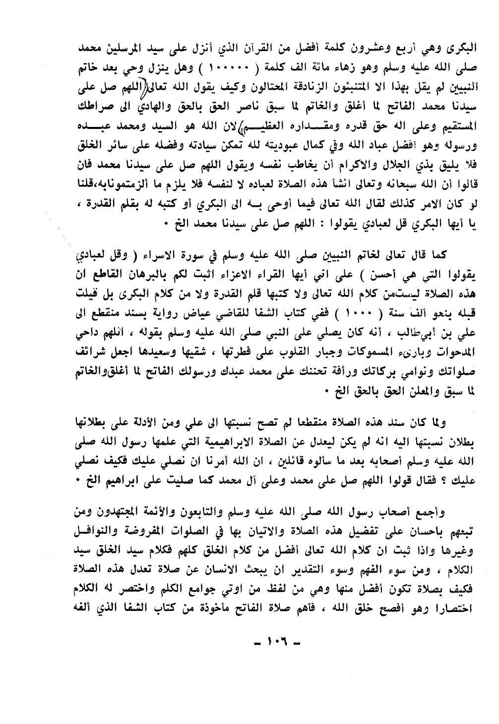 البكري وهي أربع وعشرون كلمة أفضل من القرآن الذي أنزل على سيد المرسلين محمد صلى الله عليه وسلم وهو زهاء مائة ألف كلمة (100000) وهل ينزل وحي بعد خاتم النبيين لم يقل بهذا إلا المتنبئون الزنادقة المحتالون وكيف يقول الله تعالى اللهم صل على سيدنا محمد الفاتح لما اغلق والخاتم لما سبق ناصر الحق بالحق والهادي إلى صراطك المستقيم وعلى آله حق قدره ومقداره العظيم لأن الله هو السيد ومحمد عبده ورسوله وهو أفضل عباد الله وفي كمال عبوديته لله تمكن سيادته وفضله على سائر الخلق فلا يليق بذي الجلال والإكرام أن يخاطب نفسه ويقول اللهم صل على سيدنا محمد فإن قالوا إن الله أنشأ هذه الصلاة لعباده لا لنفسه فلا يلزم ما ألزمتمونا به قلنا لو كان الأمر كذلك لقال الله تعالى فيما أوحينا به إلى البكري أو كتبه له بقلم القدرة، يا أيها البكري قل لعبادي يقولوا: اللهم صل على محمد الخ.