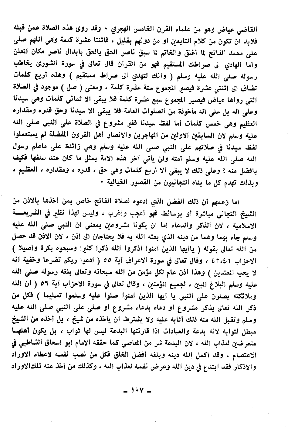 القاضي عياض وهو من علماء القرن الخامس الهجري، وقد روى هذه الصلاة عمن قبله فلا بد أن تكون من كلام التابعين أو من دونهم بقليل، فاثنتا عشرة كلمة وهي اللهم صلى الله عليه وسلم على محمد الفاتح لما أغلق والخاتم لما سبق ناصر الحق بإبدال ناصر مكان المعلن وأما الهادي إلى صراطك المستقيم فهو من القرآن قال تعالى في سورة الشورى يخاطب رسوله صلى الله عليه وسلم: {وَإِنَّكَ لَتَهْدِي إِلَى صِرَاطٍ مُسْتَقِيمٍ} وهذه أربع كلمات تضاف إلى اثنتي عشرة فيصير المجموع ست عشرة كلمة، ومعنى (صل) موجود في الصلاة التي رواها عياض فيصير المجموع سبع عشرة كلمة فلا يبقى إلا ثماني كلمات وهي سيدنا وعلى آله بل على آله مأخوذة من الصلوات العامة فلا يبقى إلا سيدنا وحق قدره ومقداره العظيم وهي خمس كلمات أما لفظ سيدنا فغير مشروع في الصلاة على النبي صلى الله عليه وسلم لأن السابقين الأولين من المهاجرين والأنصار أهل القرون المفضلة لم يستعملوا لفظ سيدنا في صلاتهم على النبي صلى الله عليه وسلم وهي زائدة على ما علَّم رسول الله صلى الله عليه وسلم أمته ولن يأتي آخر هذه الأمة بمثل ما كان عند سلفها فكيف بأفضل منه؟ وعلى ذلك لا يبقى إلا أربع كلمات وهي حق، قدره، ومقداره، العظيم، وبذلك تهدم كل ما بناه التجانيون من القصور الخالية.