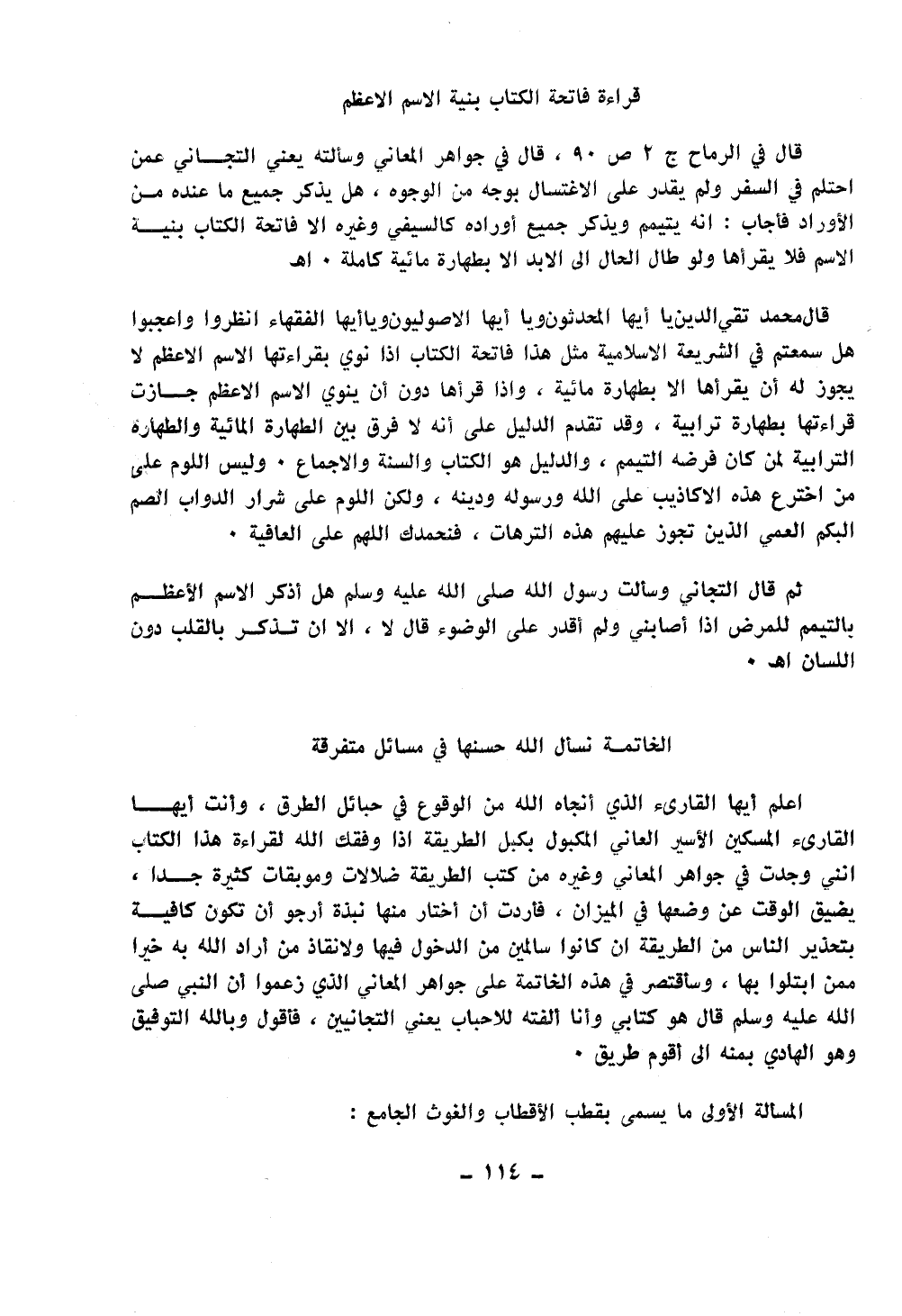 قال محمد تقي الدين: يا أيها المحدِّثون ويا أيها الأصوليون ويا أيها الفقهاء انظروا واعجبوا هل سمعتم في الشريعة الإسلامية مثل هذا فاتحة الكتاب إذا نوى بقراءتها الإسم الأعظم لا يجوز له أن يقرأها إلا بطهارة مائية، وإذا قرأها دون أن ينوي الاسم الأعظم جازت قراءتها بطهارة ترابية، وقد تقدم الدليل على أن لا فرق بين الطهارة المائية والطهارة الترابية لمن كان فرضه التيمم، والدليل هو الكتاب والسنة والإجماع. وليس اللوم على من اخترع هذه الأكاذيب على الله ورسوله ودينه، ولكن اللوم على شرار الدواب الصم البكم العمي الذين تجوز عليهم هذه الترهات، فنحمدك اللهم على العافية.