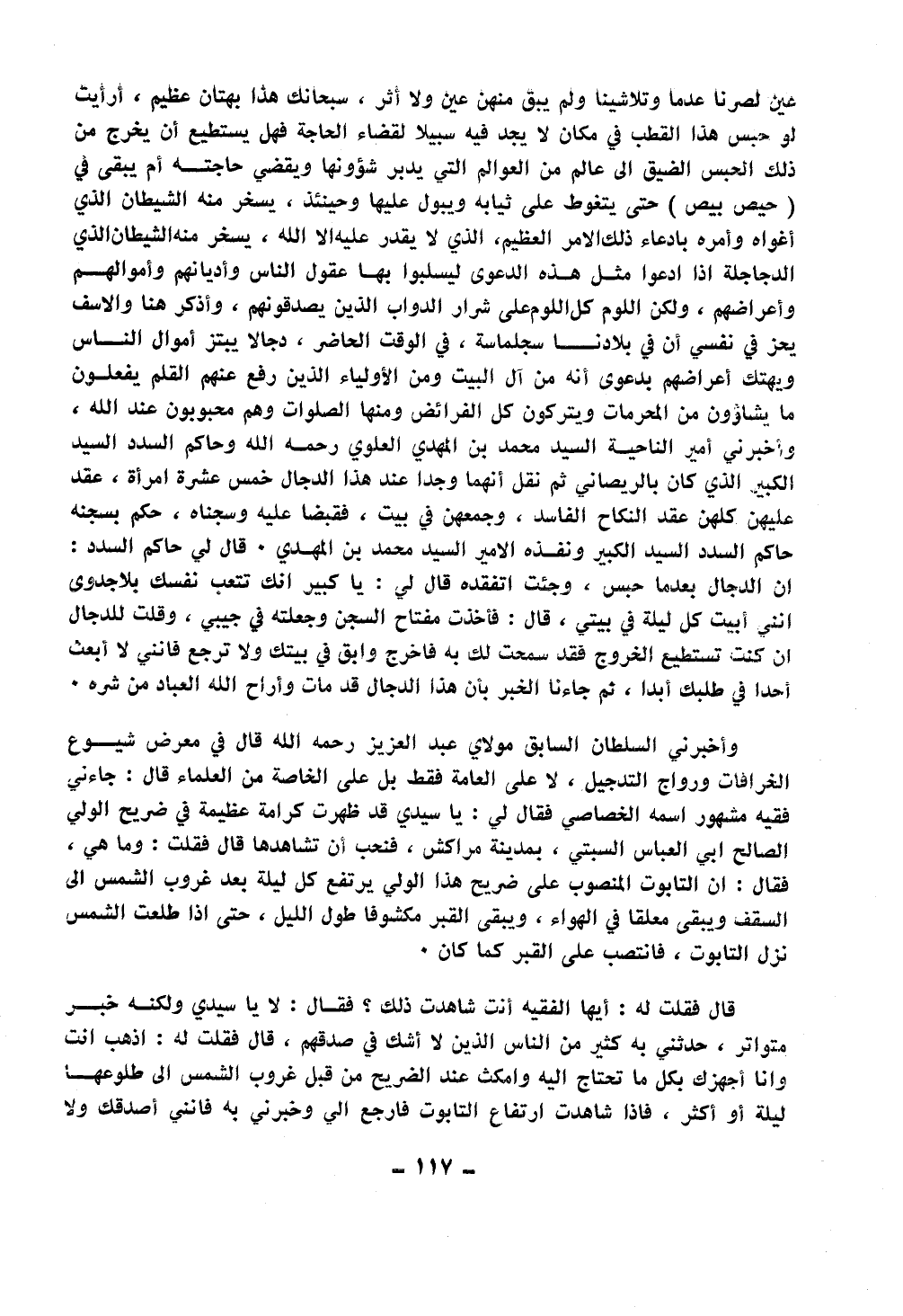 عين لصرنا عدما ولا تلاشينا ولم يبق لهن أثر، سبحانك هذا بهتان عظيم، أرأيت لو حبس هذا القطب في مكان لا يجد فيه سبيلا لقضاء الحاجة فهل يستطيع أن يخرج من ذلك الحبس الضيق إلى عالم من العوالم التي يدبر شؤونها ويقضي حاجته أم يبقى في (حيص بيص) حتى يتغوط على ثيابه ويبول عليها وحينئذ، يسخر منه الشيطان الذي أغواه وأمره بادعاء ذلك الأمر العظيم، الذي لا يقدر عليه إلا الله، ليس اللوم على هؤلاء الدجاجلة إذا ما ادعوا مثل هذه الدعوى ليسلبوا بها عقول الناس وأديانهم وأموالهم وأعراضهم، ولكن اللوم كل اللوم على شرار الدواب الذين يصدقونهم، وأذكر هنا والأسف يحز في نفسي أن في بلادنا سجلماسة، في الوقت الحاضر، دجالا يبتز أموال الناس ويهتك أعراضهم بدعوى أنه من آل البيت ومن الأولياء الذين رفع عنهم القلم يفعلون ما يشاءون من المحرمات ويتركون كل الفرائض ومنها الصلوات وهم محبوبون عند الله، وأخبرني أمير المنطقة محمد بن المهدي العلوي رحمه الله وحاكم السدد السيد الكبير الذي كان بالريصاني ثم نقل أنهما وجدا عند هذا الدجال خمس عشرة امرأة، عقد عليهن كلهن عقد النكاح الفاسد، وجمعهن في بيت، فقبضا عليه وسجناه، حكم بسجنه حاكم السدد السيد الكبير
