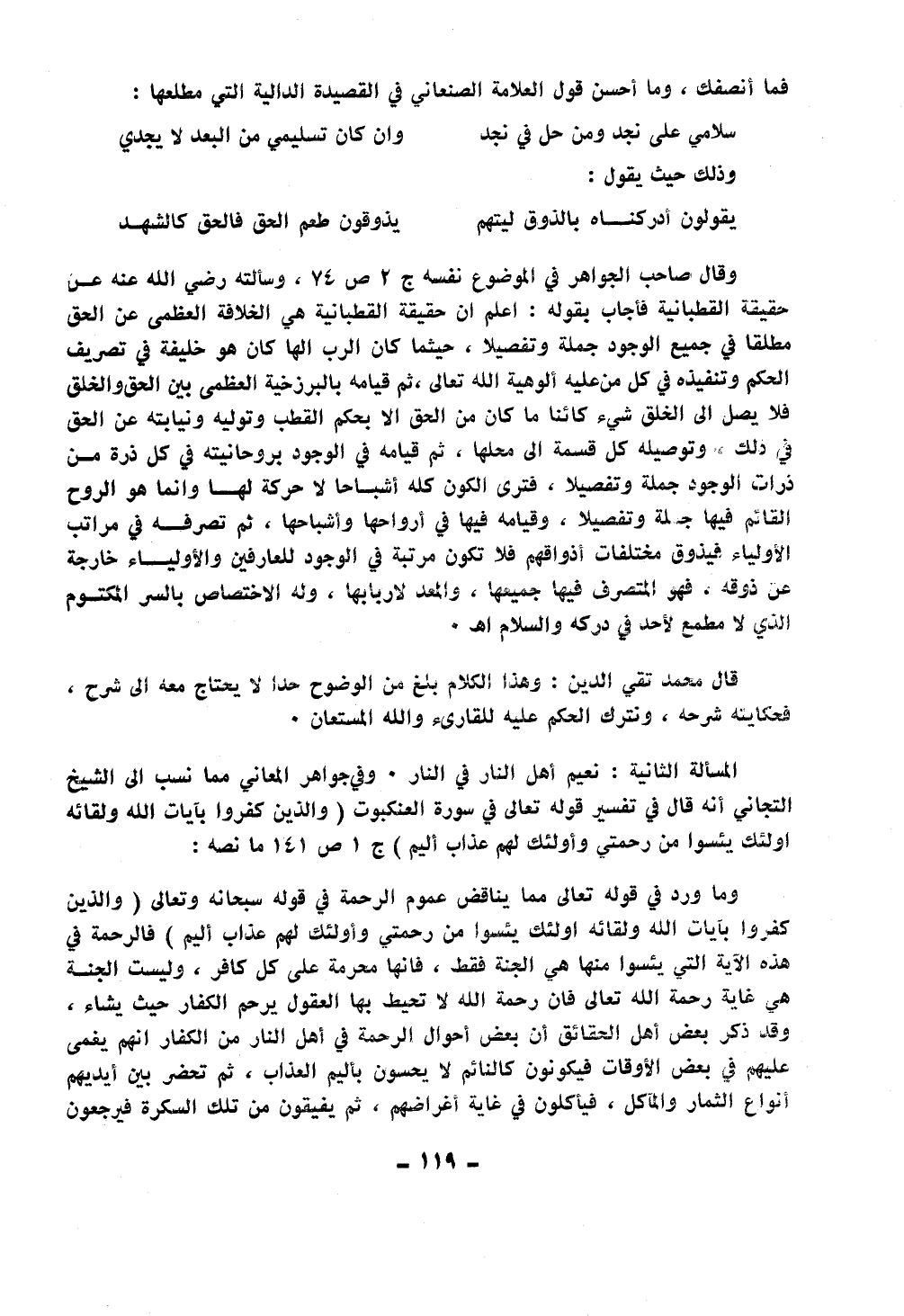 المسألة الثانية: نعيم أهل النار في النار وفي جوهر المعاني مما نسب إلى الشيخ التجاني أنه قال في تفسير قوله تعالى في سورة العنكبوت: {وَالَّذِينَ كَفَرُوا بِآَيَاتِ اللَّهِ أُولَئِكَ يَئِسُوا مِنْ رَحْمَتِي وَأُولَئِكَ لَهُمْ عَذَابٌ أَلِيمٌ (23) } ج 1ص141 ما نصه: