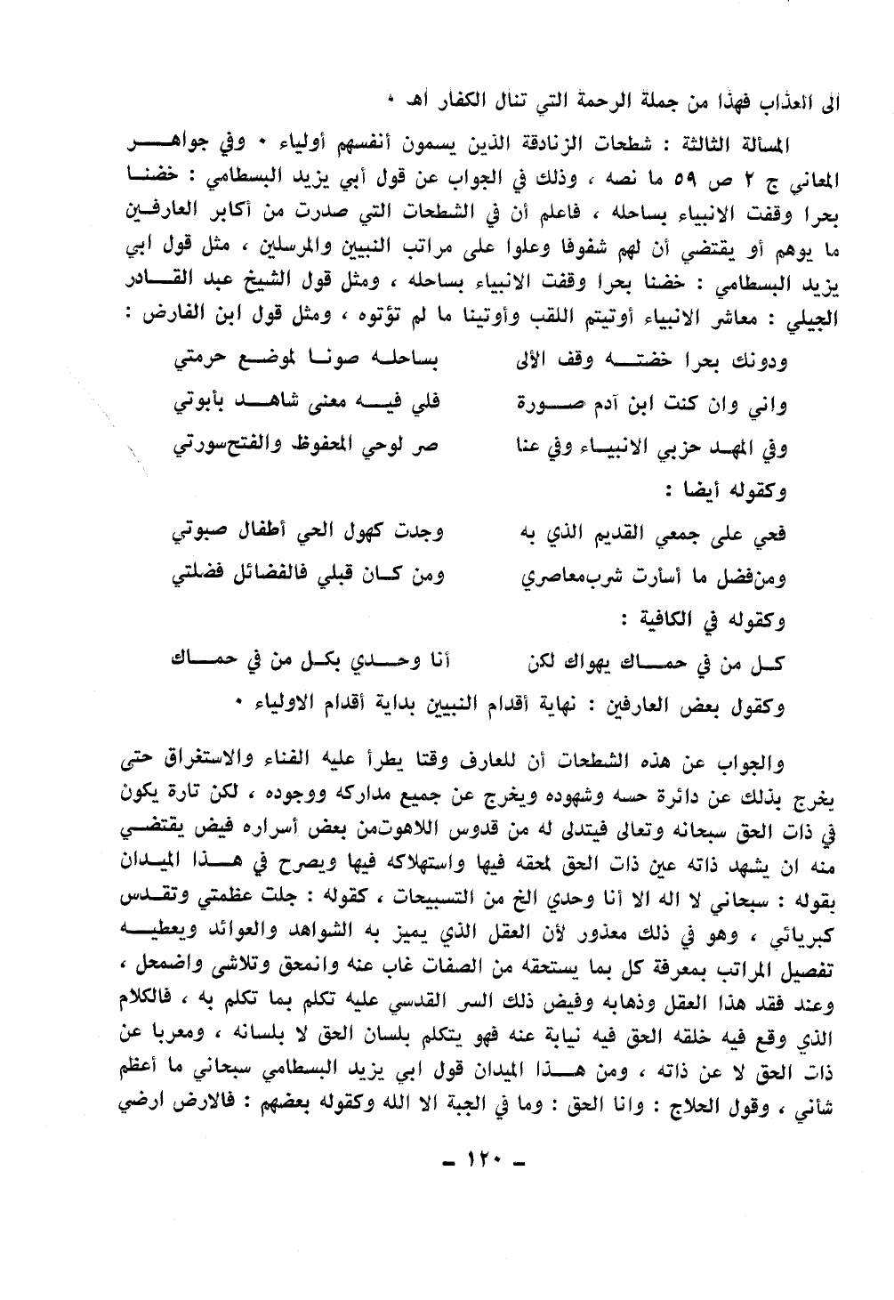 المسالة الثالثة: شطحات الزنادقة الذين يسمون أنفسهم أولياء، وفي جوهر المعاني (ج 2 ص 59) ما نصه، وذلك في الجواب عن قول أبي يزيد البسطامي: خضنا بحرا وقفت الأنبياء بساحله، فاعلم أن في الشطحات التي صدرت من أكابر العافين ما يوهم أو يقتضي أن لهم شفوفا وعلوا على المراتب النبيين والمرسلين، ومثل قول أبي يزيد البسطامي: خضنا بحرا وقفت الأنبياء بساحله، ومثل قول الشيخ عبد القادر الجيلي: معاشر الأنبياء أوتيتم اللقب وأوتينا ما لم تؤتوه، ومثل قول ابن الفارض: