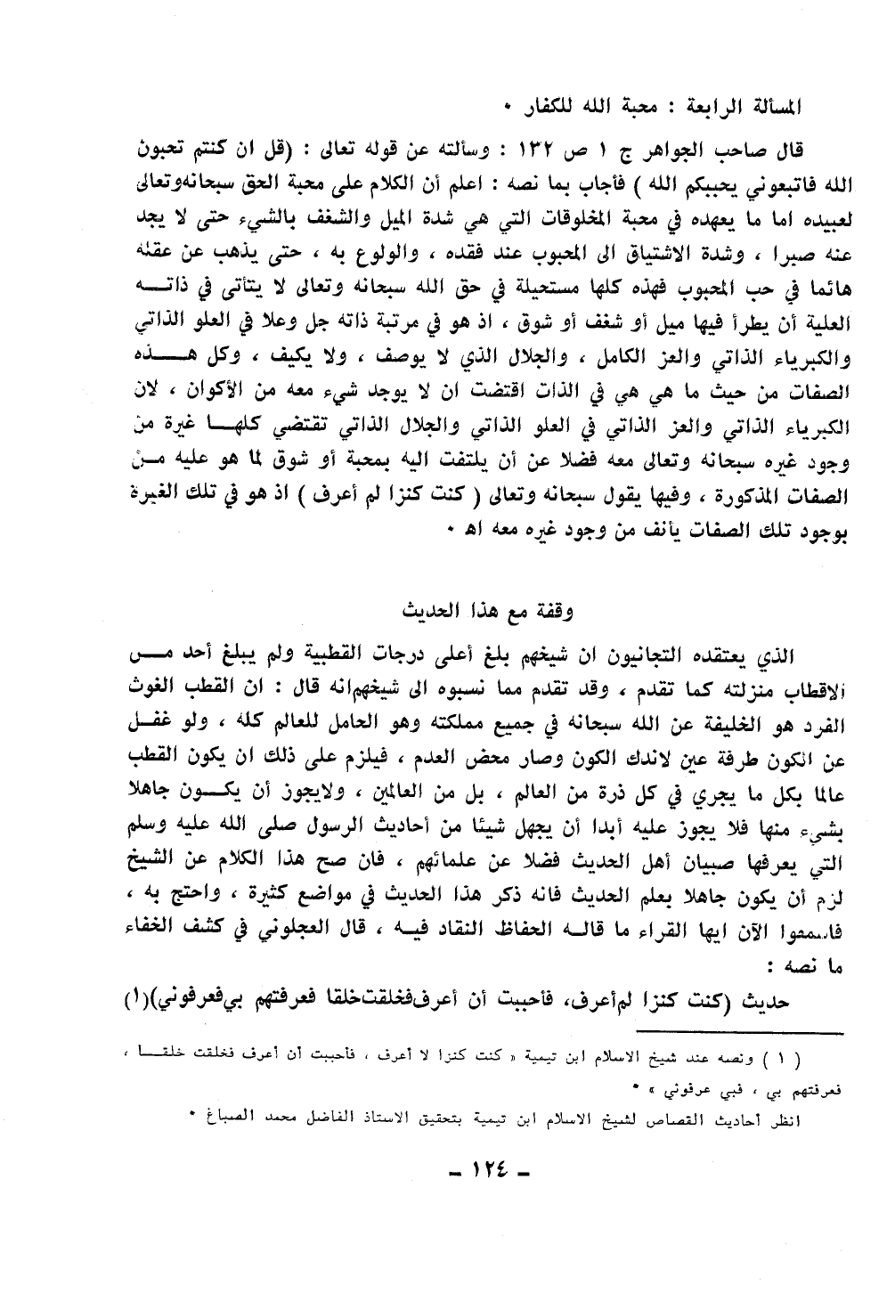 قال صاحب الجواهر ج1ص132: وسألته عن قوله تعالى: {قُلْ إِنْ كُنْتُمْ تُحِبُّونَ اللَّهَ فَاتَّبِعُونِي يُحْبِبْكُمُ اللَّهُ} فأجاب بما نصه: اعلم أن محبة الحق سبحانه تعالى لعبيده إما ما يعهده في محبة المخلوقات التي هي شدة الميل والشغف بالشيء حتى لا يجد عنه صبرا، وشدة الاشتياق إلى المحبوب عند فقده، والولوع به، حتى يذهب عن عقله هائما في حب المحبوب فهذه كلها مستحيلة في حق الله سبحانه وتعالى لا يتأتى في ذاته العلية أن يطرأ فيها ميل أو شغف أو شوق، إذ هو في مرتبة ذاته جلا وعلا في العلو الذاتي والكبرياء الذاتي والعز الكامل، والجلال الذي لا يوصف، ولا يكيف، وكل هذه الصفات من حيث ما هي هِي في الذات اقتضت أنْ لا يوجد شيء معه من الأكوان، لأن الكبرياء الذاتي والعز الذاتي في العلو الذاتي والجلال الذاتي تقتضي كلها غيرة من وجود غيره سبحانه وتعالى معه فضلا عن أن يلتفت إليه بمحبة أو شوق لما هو عليه من الصفات المذكورة، وفيها يقول سبحان هو تعالى (كنت كنزا لم أعرف) إذ هو في تلك الغيرة بوجود تلك الصفات يأنف من وجود غيره معه. اهـ