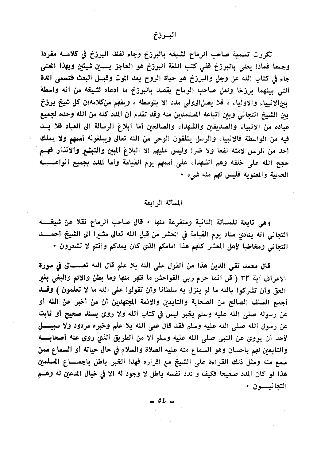 قال محمد تقي الدين الهلالي هذا من القول على بلا علم قال الله تعالى في سورة الأعراف آية 33: {قُلْ إِنَّمَا حَرَّمَ رَبِّيَ الْفَوَاحِشَ مَا ظَهَرَ مِنْهَا وَمَا بَطَنَ وَالْإِثْمَ وَالْبَغْيَ بِغَيْرِ الْحَقِّ وَأَنْ تُشْرِكُوا بِاللَّهِ مَا لَمْ يُنَزِّلْ بِهِ سُلْطَانًا وَأَنْ تَقُولُوا عَلَى اللَّهِ مَا لَا تَعْلَمُونَ (33) } وقد أجمع السلف الصالح من الصحابة والتابعين والأئمة المجتهدين أن من أخبر عن الله أو عن رسول الله صلى الله عليه وسلم بخبر ليس في كتاب الله ولا روى بسند صحيح إلى رسول الله صلى الله عليه وسلم فقد قال على الله بلا علم وخبره مردود ولا سبيل لأحد أن يروي عن النبي صلى الله عليه وسلم إلا من الطريق الذي روى عنه أصحابه والتابعين لهم بإحسان وهو السماع منه عليه الصلاة والسلام في حال حياته أو السماع ممن سمع منه ومثل ذلك القراءة على الشيخ مع إقراره فهذا الخبر باطل بإجماع المسلمين هذا لو كان المدد صحيحا فكيف والمدد نفسه باطل لا وجود له إلا في خيال المدعين له وهم التجانيون.