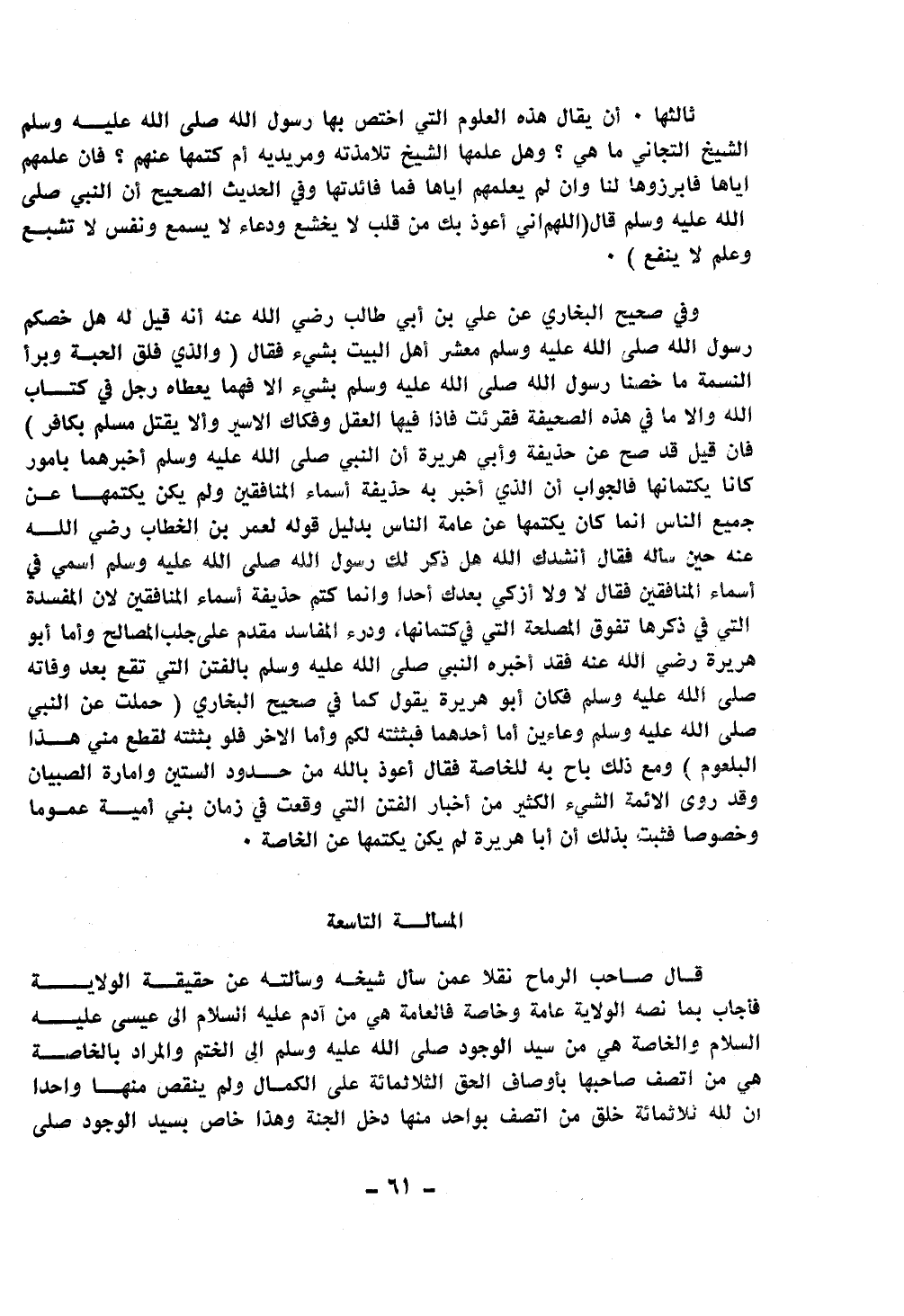 ثالثها: إن يقال هذه العلوم التي اختص بها رسول الله صلى الله عليه وسلم الشيخ التجاني ما هي؟ وهل علَّمها الشيخ تلامذته ومُريديه أم كتمها عنهم؟ فإن علمهم إياها فأبرزوها لنا وإن لم يعلمهم إياها فما فائدتها وفي الحديث الصحيح أن النبي صلى الله عليه وسلم قال: (اللهم إني أعوذ بك من قلب لا يخشع ودعاء لا يسمع ونفس لا تشبع وعلم لا ينفع) .