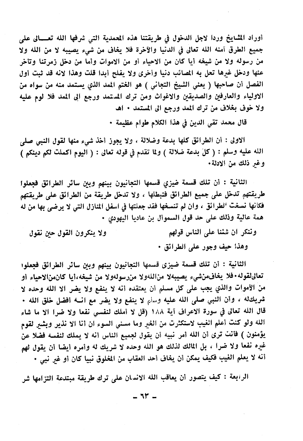 الثالثة: أن تلك قسمة ضيزى قسمها التجانيون بينهم وبين سائر الطرائق فجعلوا تعالى لقوله. فلا يخاف من شيء يصيبه لا من الله ولا من رسوله ولا من شيخه أيا كان من الأحياء أو من الأموات والذي يجب على كل مسلم أن يعتقده أنه لا ينفع ولا يضر إلا الله وحده لا شريك له وأن النبي صلى الله عليه وسلم لا ينفع ولا يضر مع أنه أفضل خلق الله قال الله تعالى في سورة الأعراف آية 188: {قُلْ لَا أَمْلِكُ لِنَفْسِي نَفْعًا وَلَا ضَرًّا إِلَّا مَا شَاءَ اللَّهُ وَلَوْ كُنْتُ أَعْلَمُ الْغَيْبَ لَاسْتَكْثَرْتُ مِنَ الْخَيْرِ وَمَا مَسَّنِيَ السُّوءُ إِنْ أَنَا إِلَّا نَذِيرٌ وَبَشِيرٌ لِقَوْمٍ يُؤْمِنُونَ (188) } فأنت ترى أن الله أمر نبيه أن يقول لجميع الناس أنه لا يملك لنفسه فضلا عن غيره نفعا ولا ضرا، بل المالك لذلك هو الله وحده لا شريك الله وأمره أيضا أن يقول لهم أنه لا يعلم الغيب فكيف أن يخاف أحد العقاب من المخلوق نبيا كان أو غير نبي.