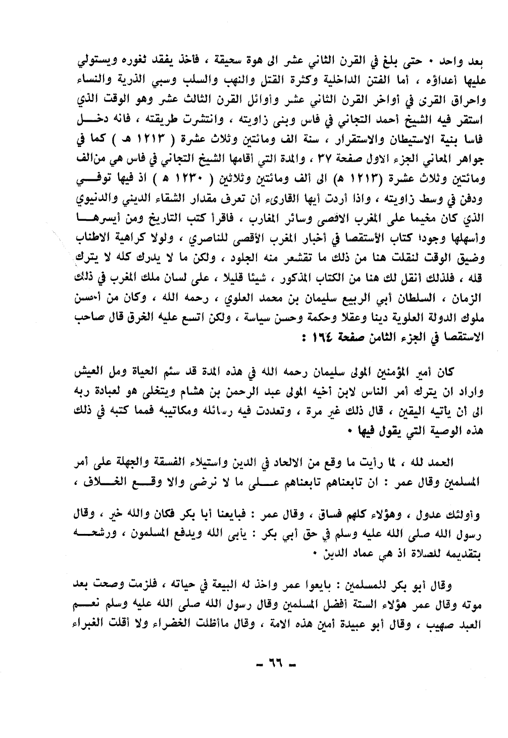 المعاني الجزء الأول صفحة 37، والمدة التي أقامها الشيخ التجاني في فاس هي من ألف ومائتين وثلاث عشرة (1213) إلى ألف ومائتين وثلاثين (1230 هـ) إذ فيها توفي ودفن في وسط زاويته، وإذا أردت أن تعرف مقدار الشقاء الديني والدنيوي الذي كان مخيما على المغرب الأقصى وسائر المغارب، فاقرأ كتب التاريخ ومن أيسرها أسهلها كتاب "الاستقصاء في أخبار المغرب الأقصى" للناصري، ولولا كراهية الإطناب وضيق الوقت لنقلت هنا ما تقشعر منه الجلود، ولكن ما لا يدرك كله لا يترك قله، فلذلك أنقل لك من الكتاب المذكور، شيئا قليلا، على لسان ملك المغرب في ذلك الزمان، السلطان أبى الربيع سليمان بن محمد العلوي، رحمه الله، وكان من أحسن ملوك الدولة المغربية دينا وعقلا وحكمة وحسن سياسة، ولكن اتسع الخرق، قال صاحب الاستقصاء في الجزء الثامن صفحة 164: